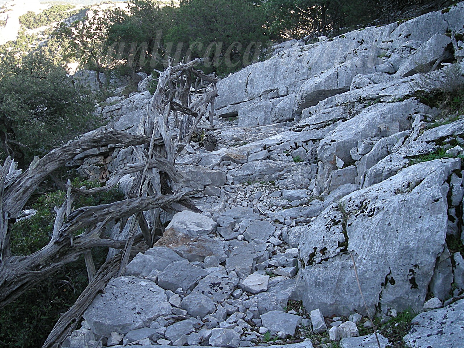Lungo il sentiero che sale all'ingresso alto della forra ci si perde; è impossibile evitare il contrattempo perchè in realtà un percorso preciso non esiste ed il cammino si svolge sempre su lastre di calcare biancastro e su "karren" taglienti come rasoi, quindi non ci sono tracce di calpestio. Ogni tanto si incontrano tranquillizzanti ometti, poi neppure quelli, ma con un po' di accortezza ed una buona carta non è difficile individuare la direzione.