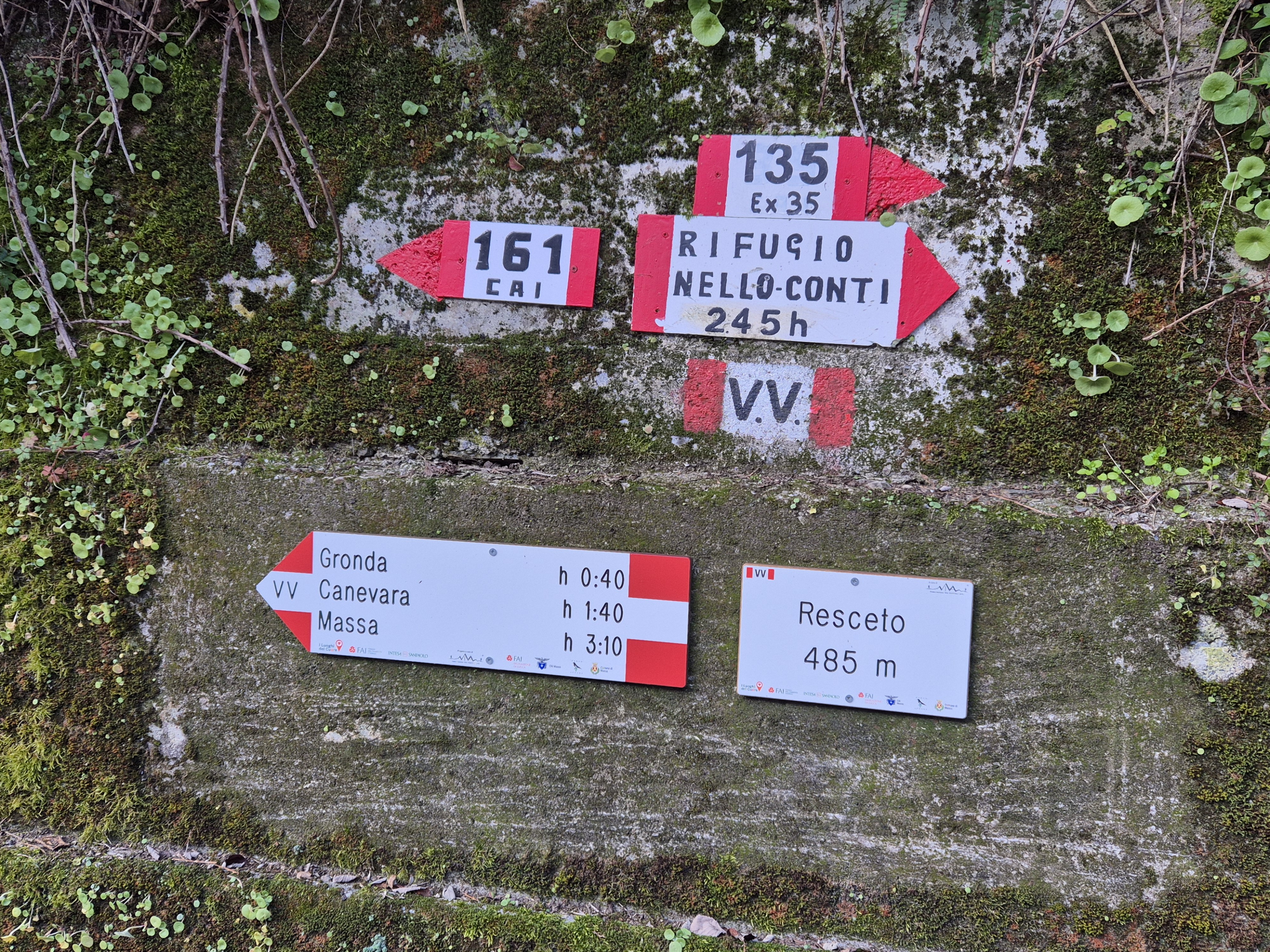 Nei pressi del parcheggio in cima al borgo sono chiare le indicazioni dei percorsi escursionistici, proseguiamo quindi a piedi lungo la strada in direzione del rifugio Nello Conti (segnavia 135).