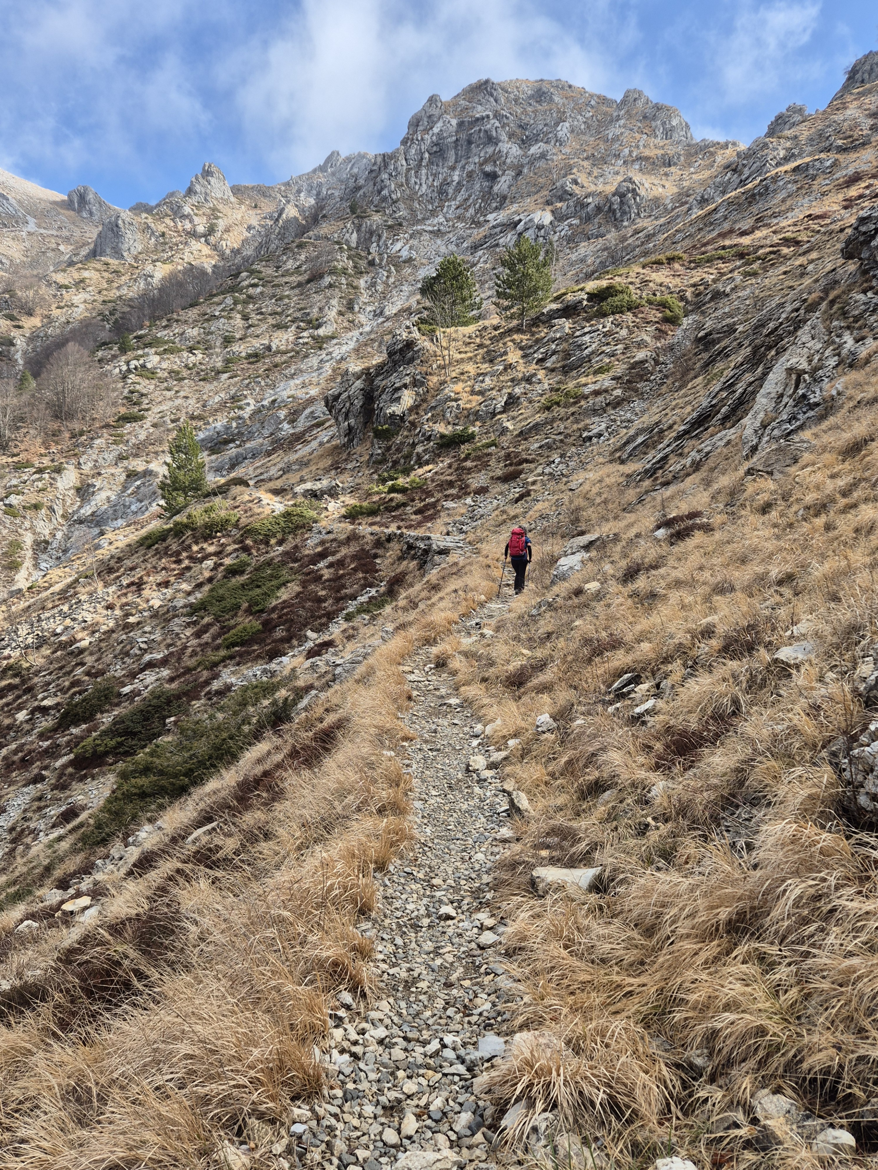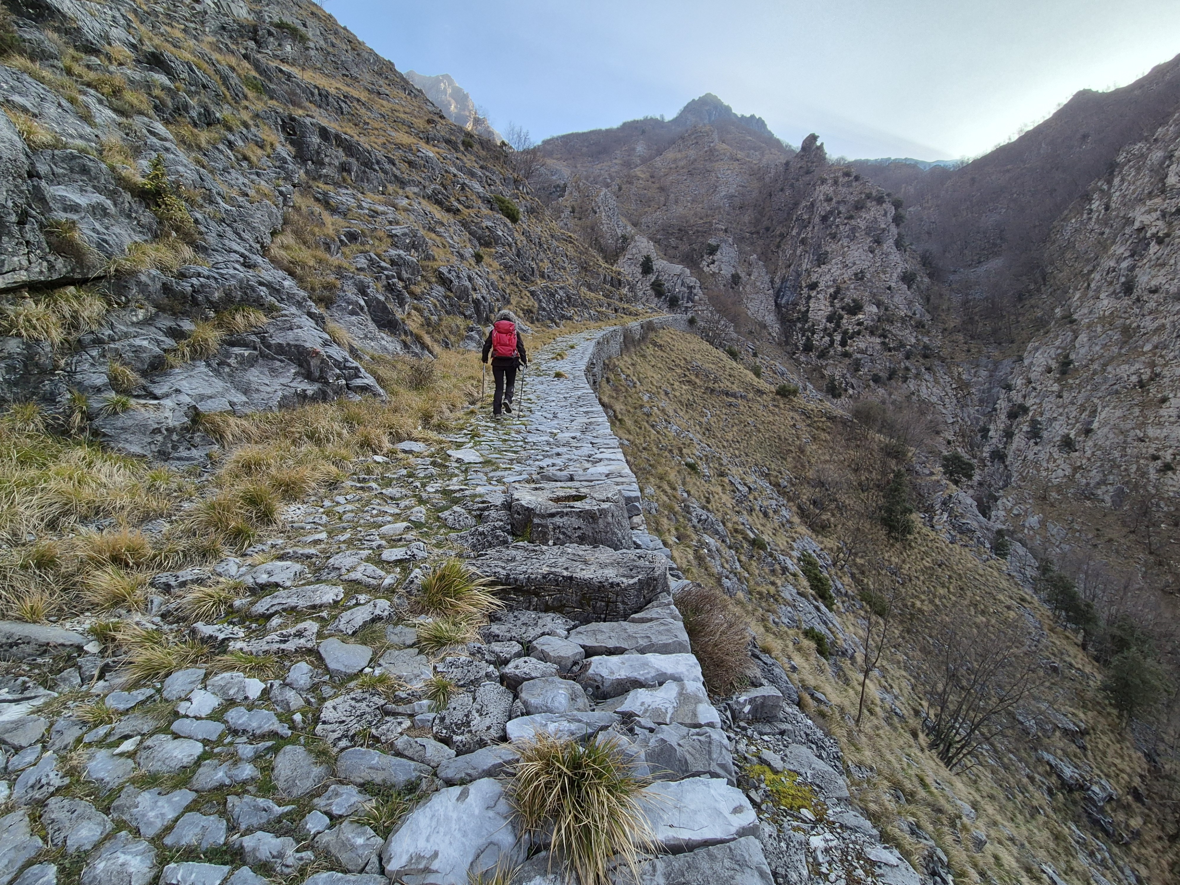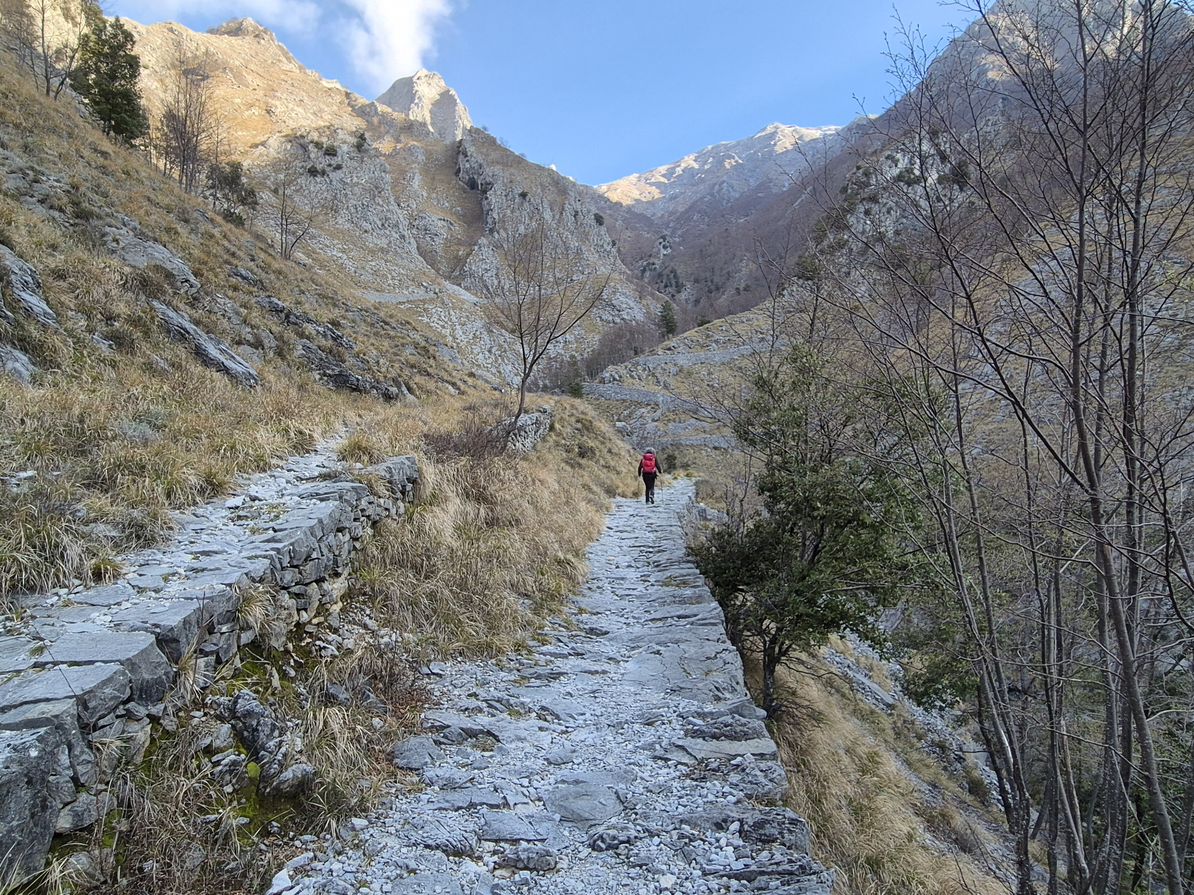 Raggiunto il fondovalle nel punto in cui su un ponticello si attraversa l'alveo del torrente, iniziamo a salire lungo il tratto lastricato, perfettamente conservato, più bello della storica via Vandelli: la pendenza del cammino non è brutale, ma decisa e costante, senza un attimo tregua per centinaia di metri di dislivello e quindi inevitabilmente impegnativa.