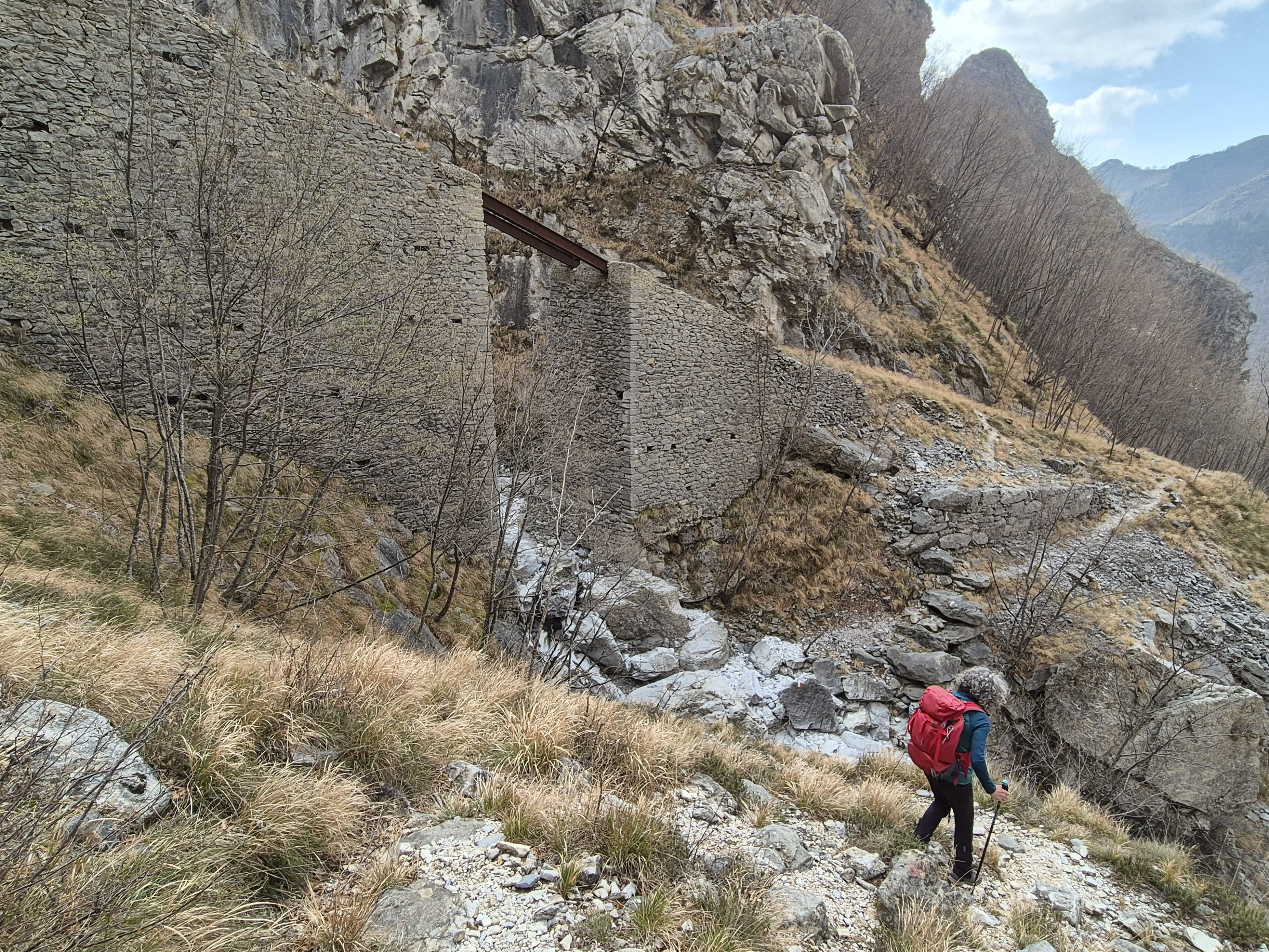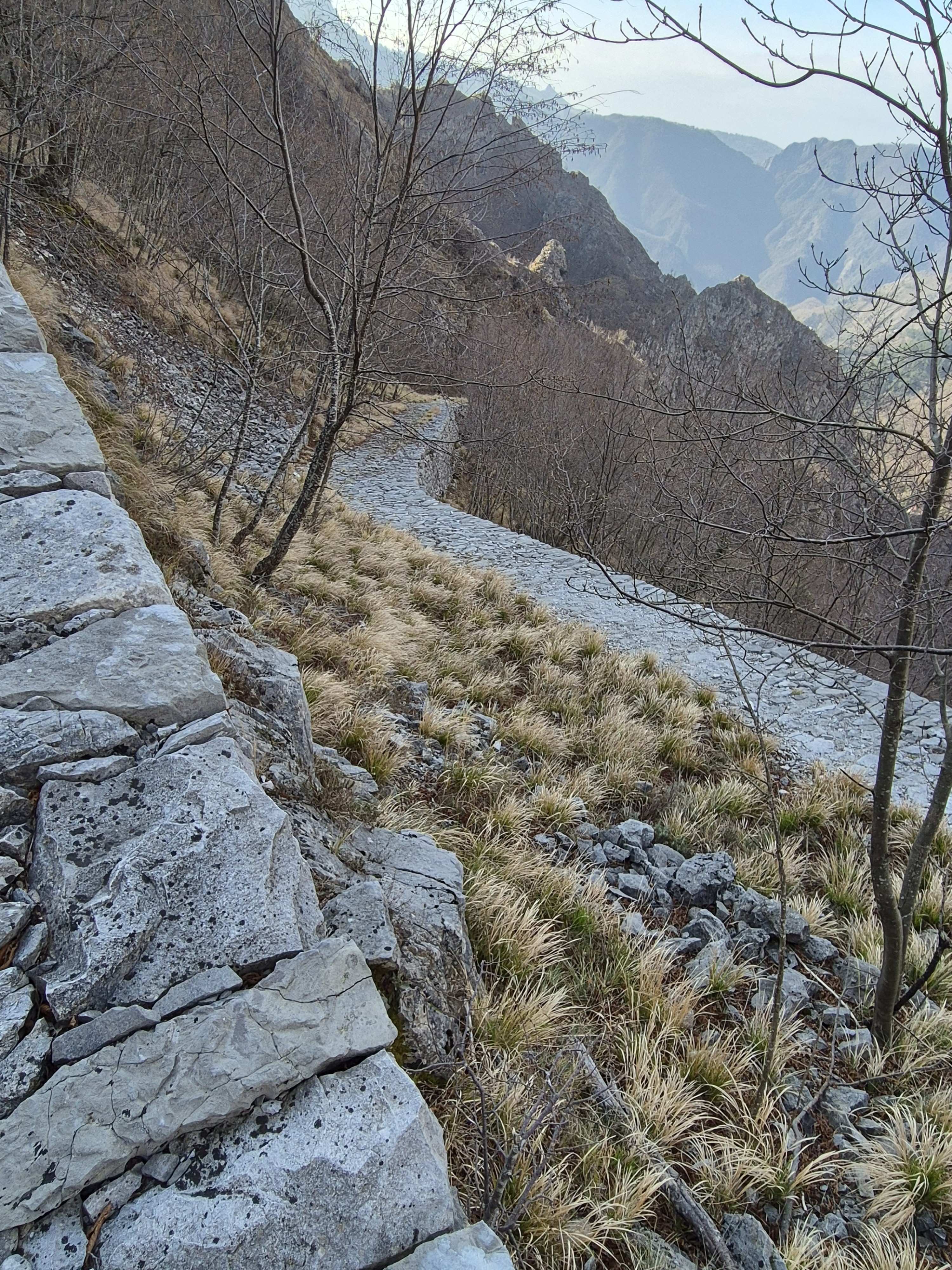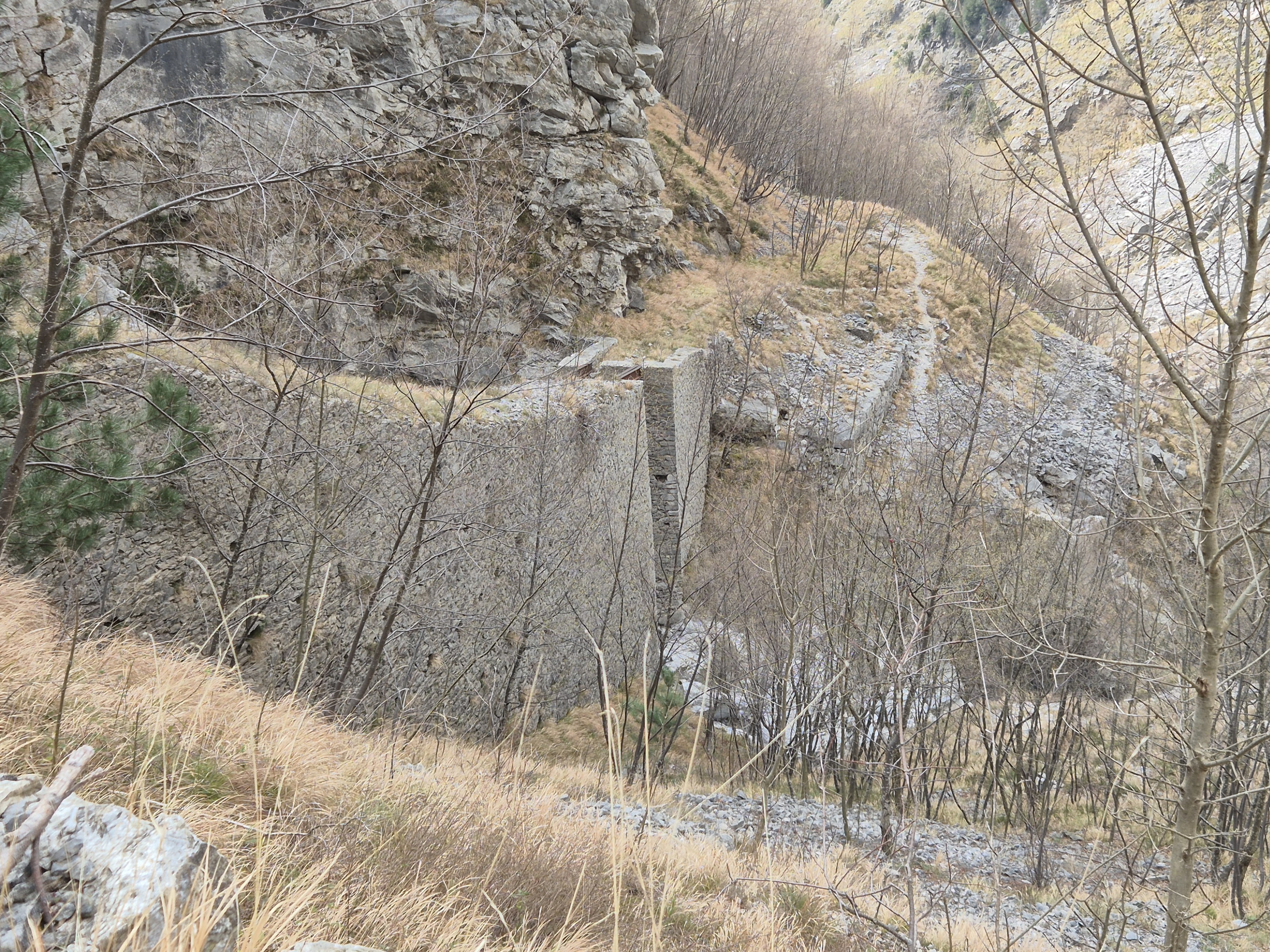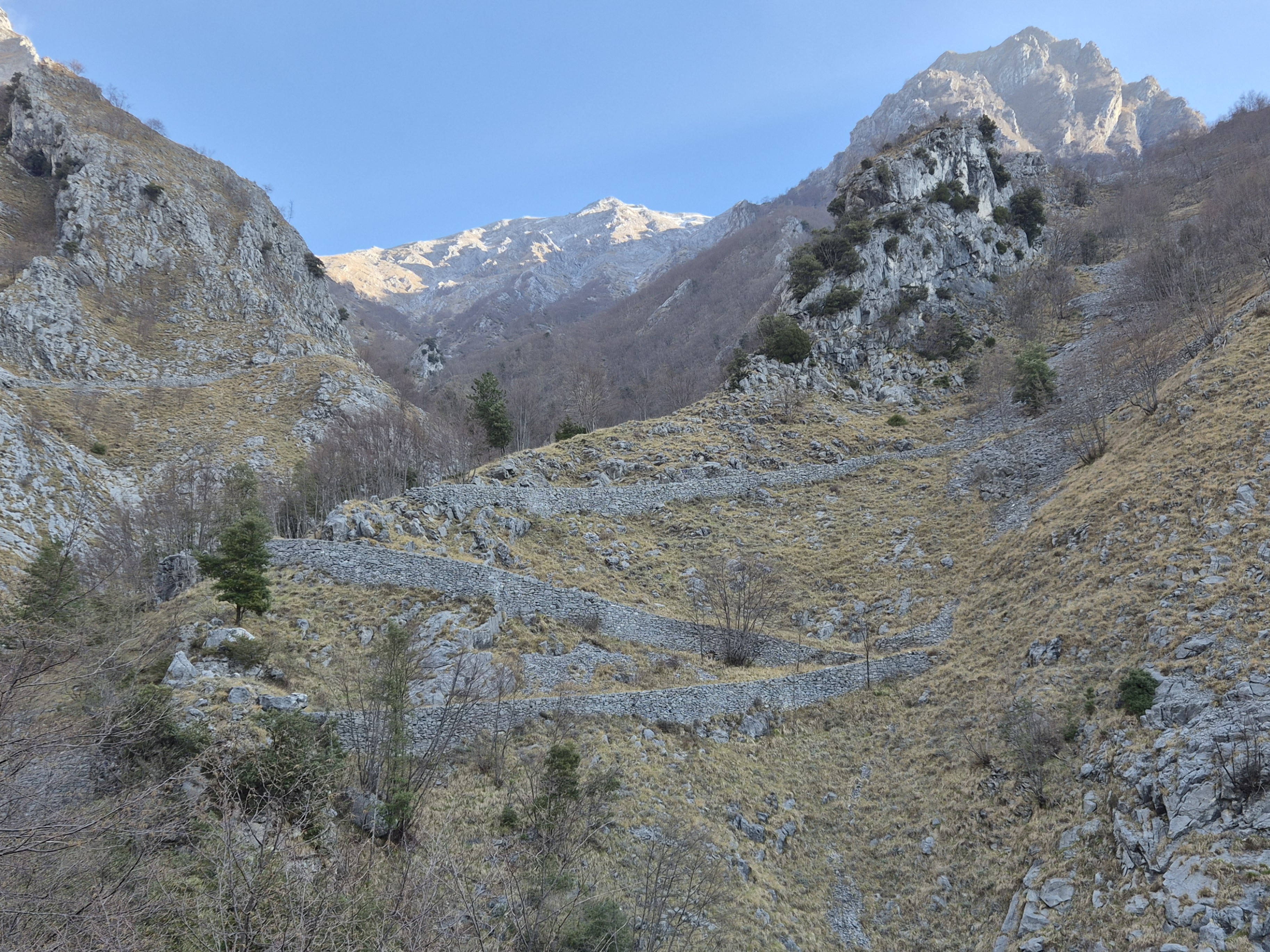 Da segnalare l'ambiente circostante sempre più aspro e severo, le antiche cave e le vie di lizza, l'orrida valle in basso a destra e le cime rocciose attorno a noi caratterizzate da versanti dirupati, scoscesi, selvaggi, apparentemente inaccessibili, ma soprattutto la splendida via che stiamo risalendo, un'opera ingegneristica sorprendente e affascinante.