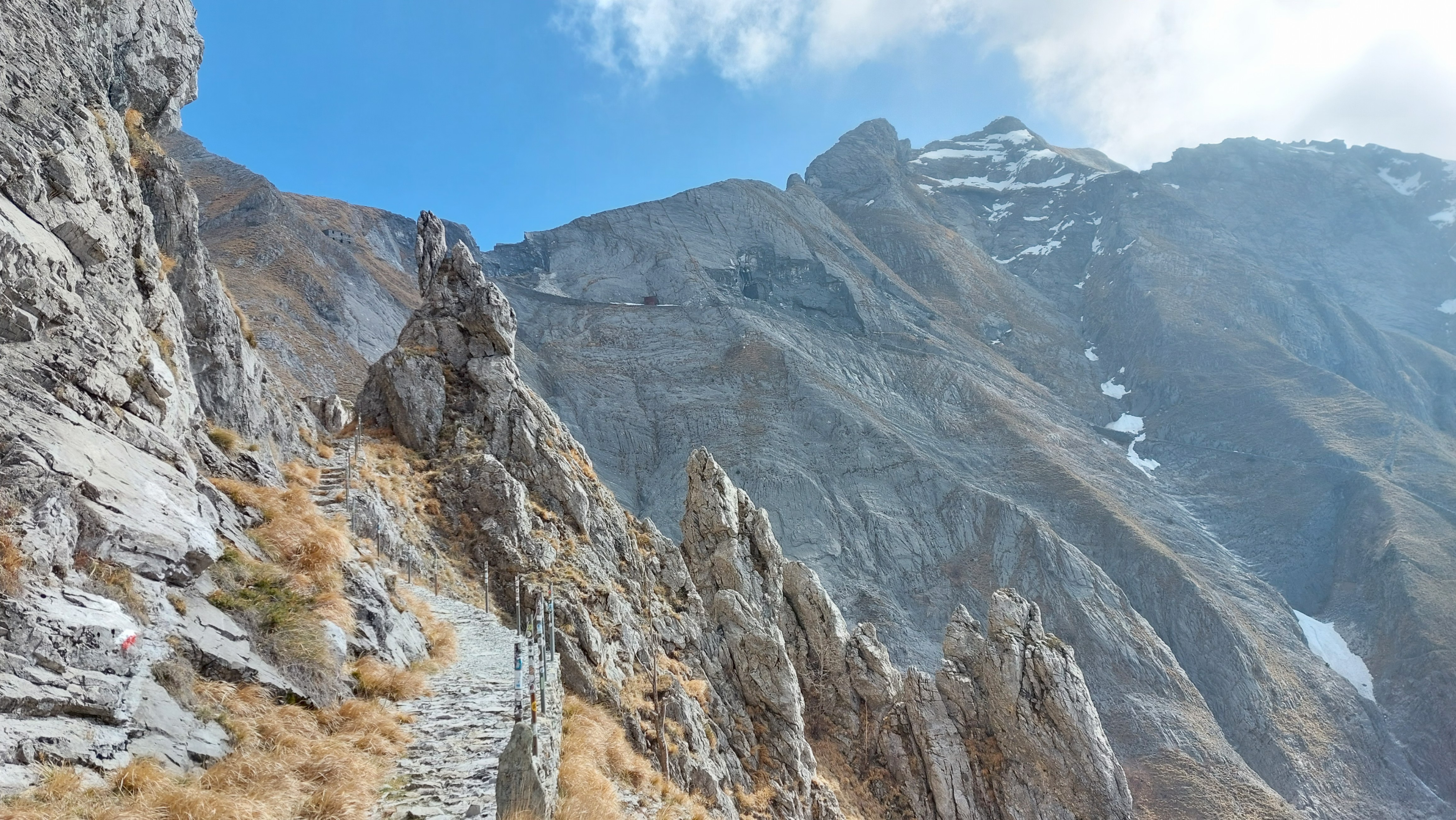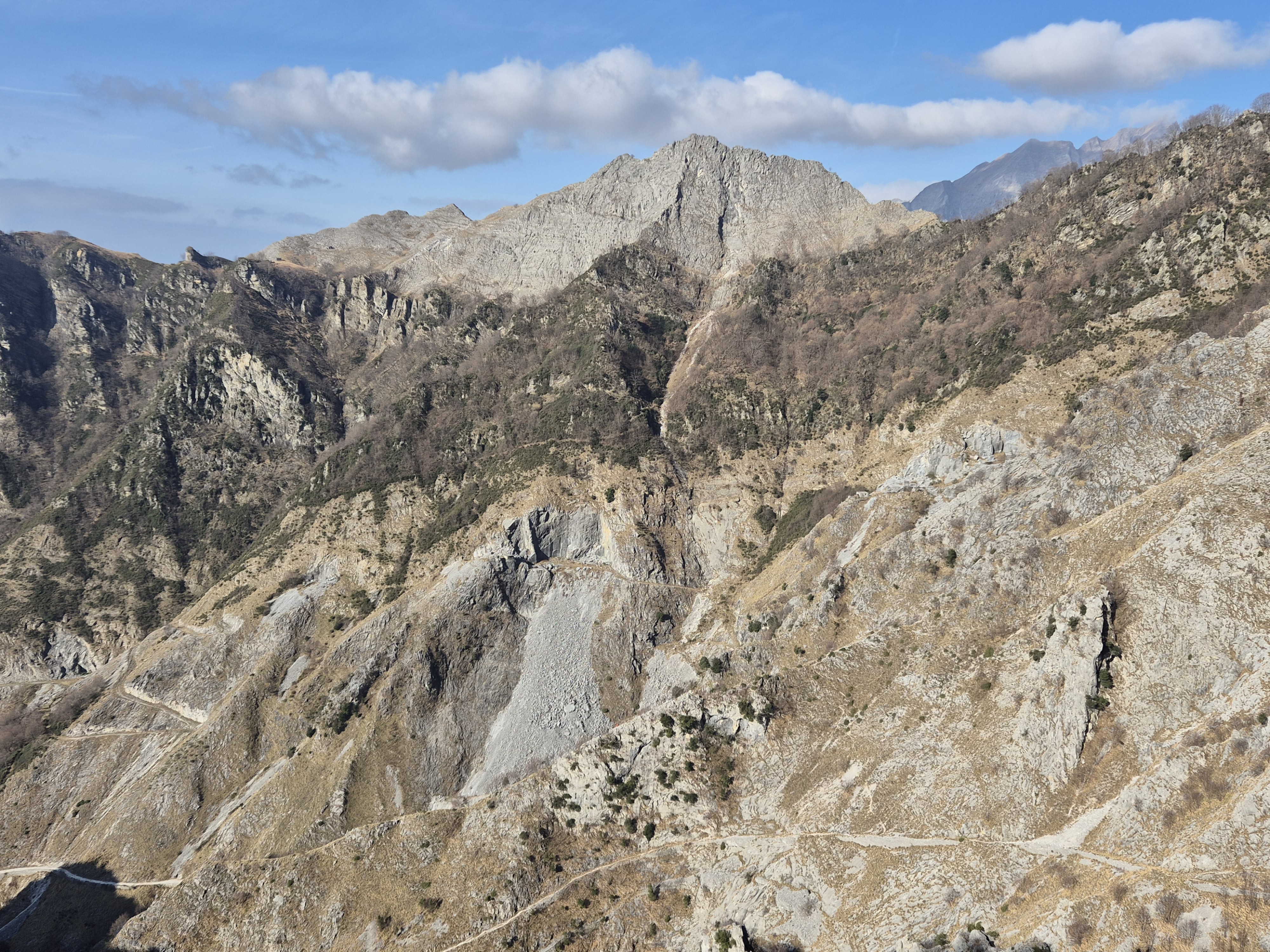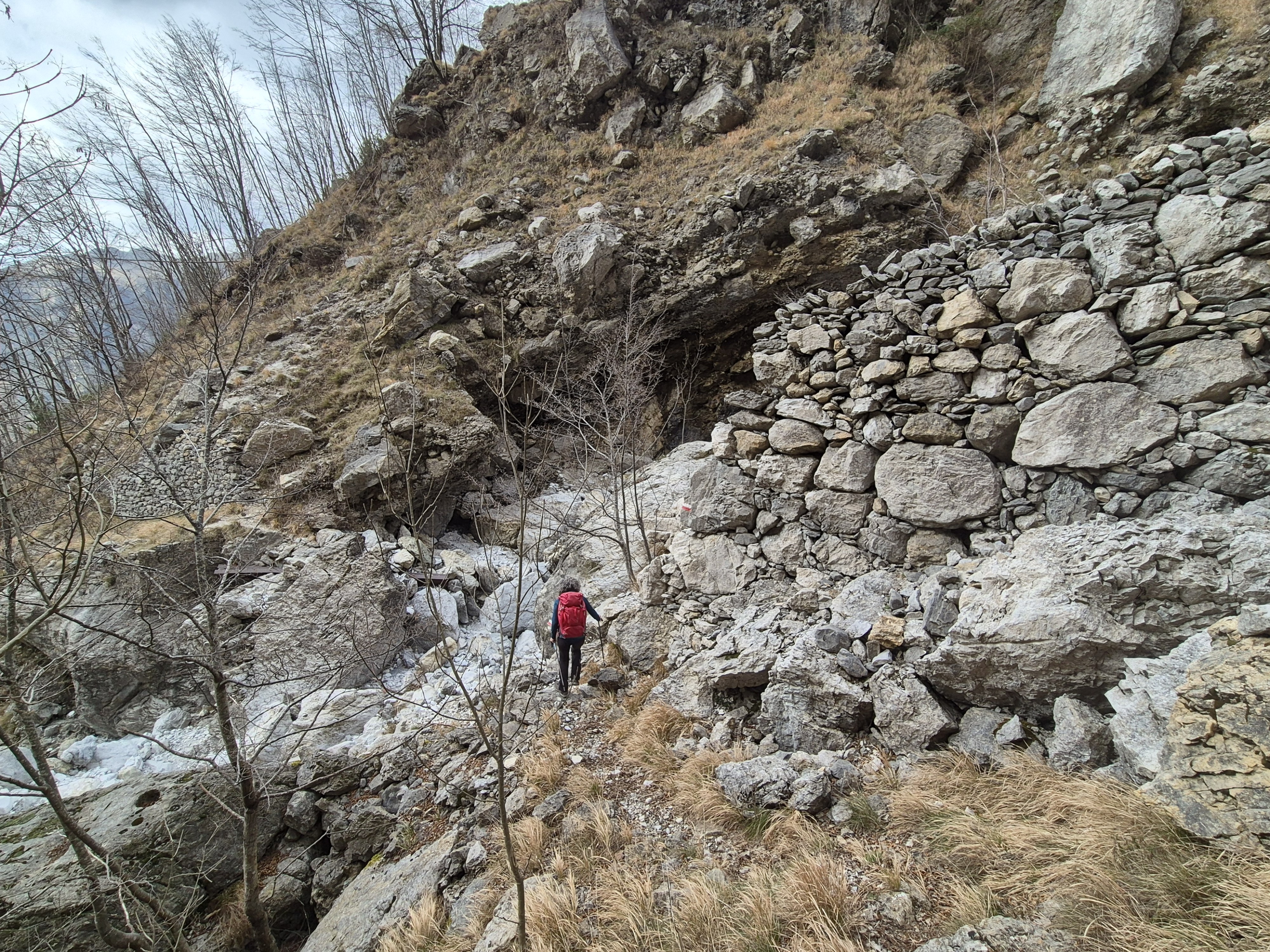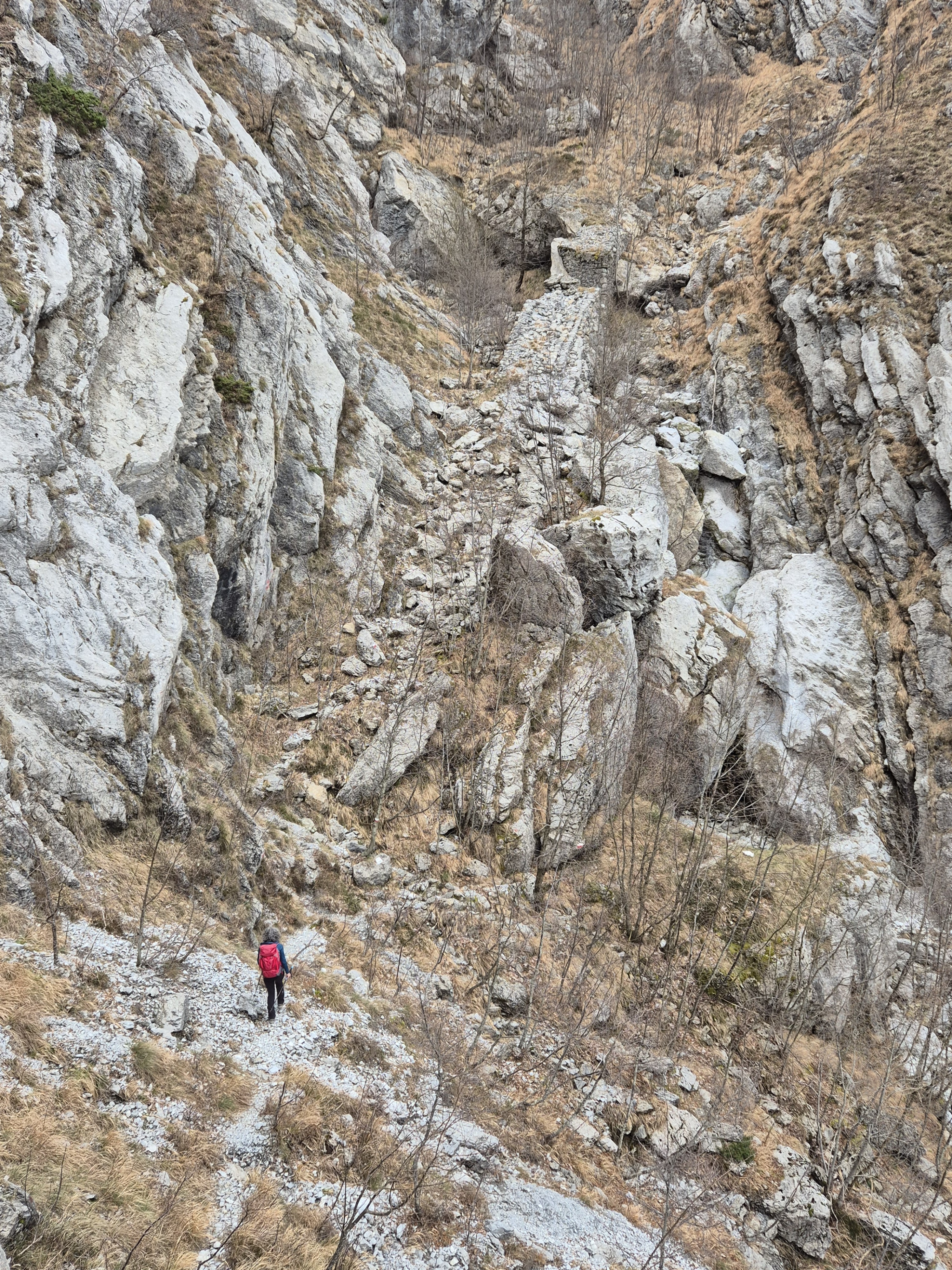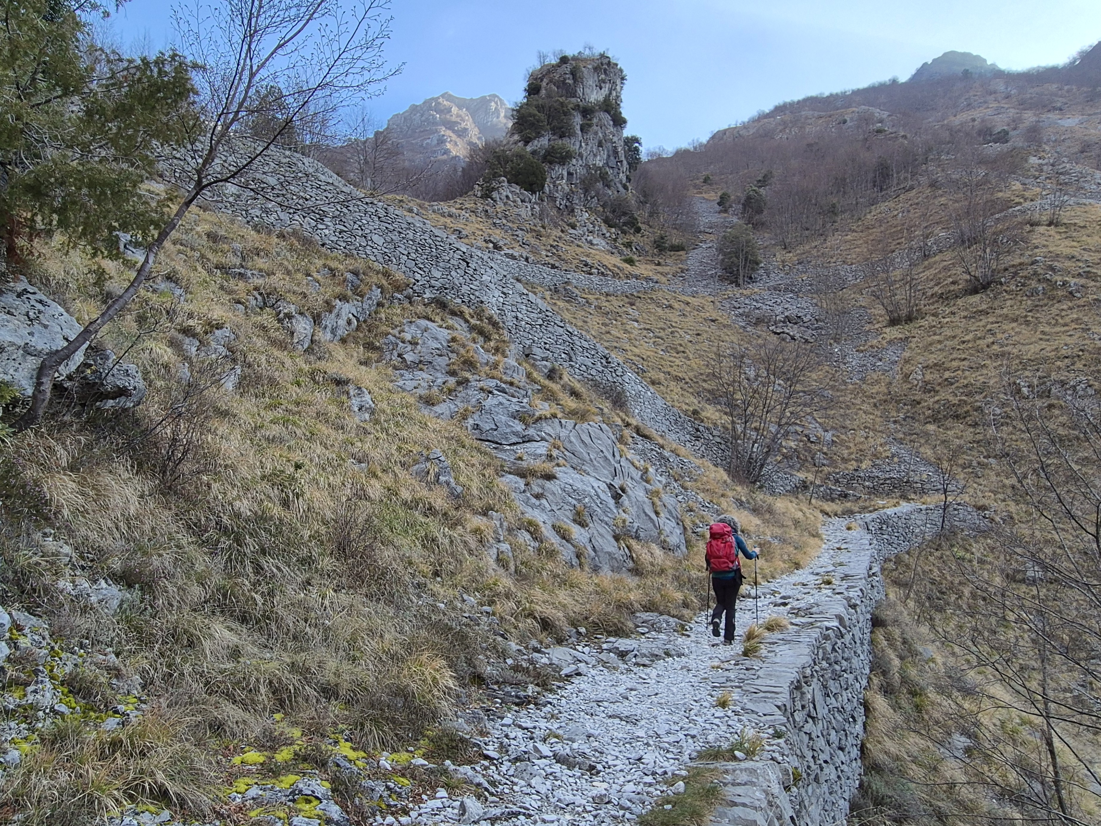 Da segnalare l'ambiente circostante sempre più aspro e severo, le antiche cave e le vie di lizza, l'orrida valle in basso a destra e le cime rocciose attorno a noi caratterizzate da versanti dirupati, scoscesi, selvaggi, apparentemente inaccessibili, ma soprattutto la splendida via che stiamo risalendo, un'opera ingegneristica sorprendente e affascinante.