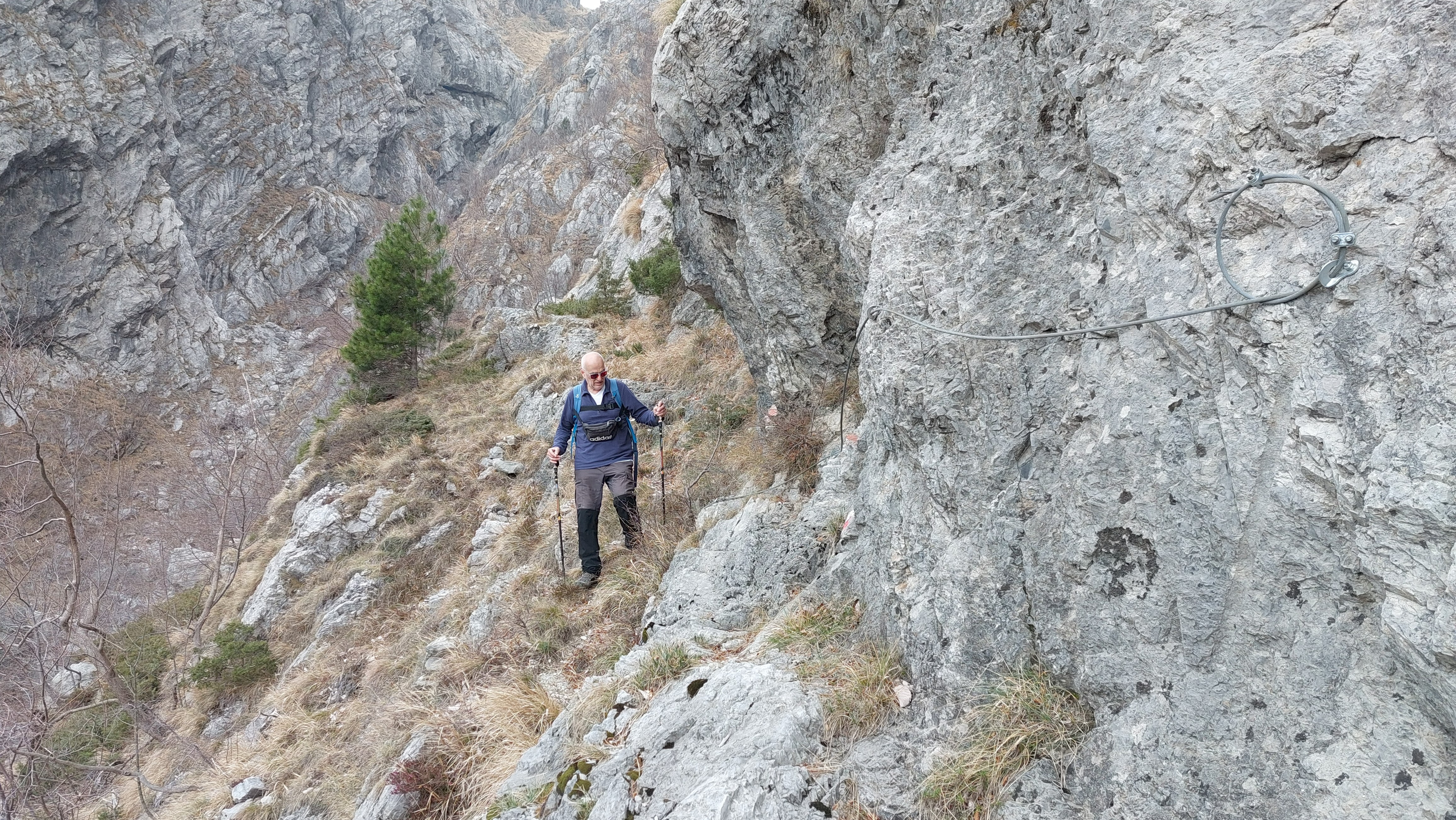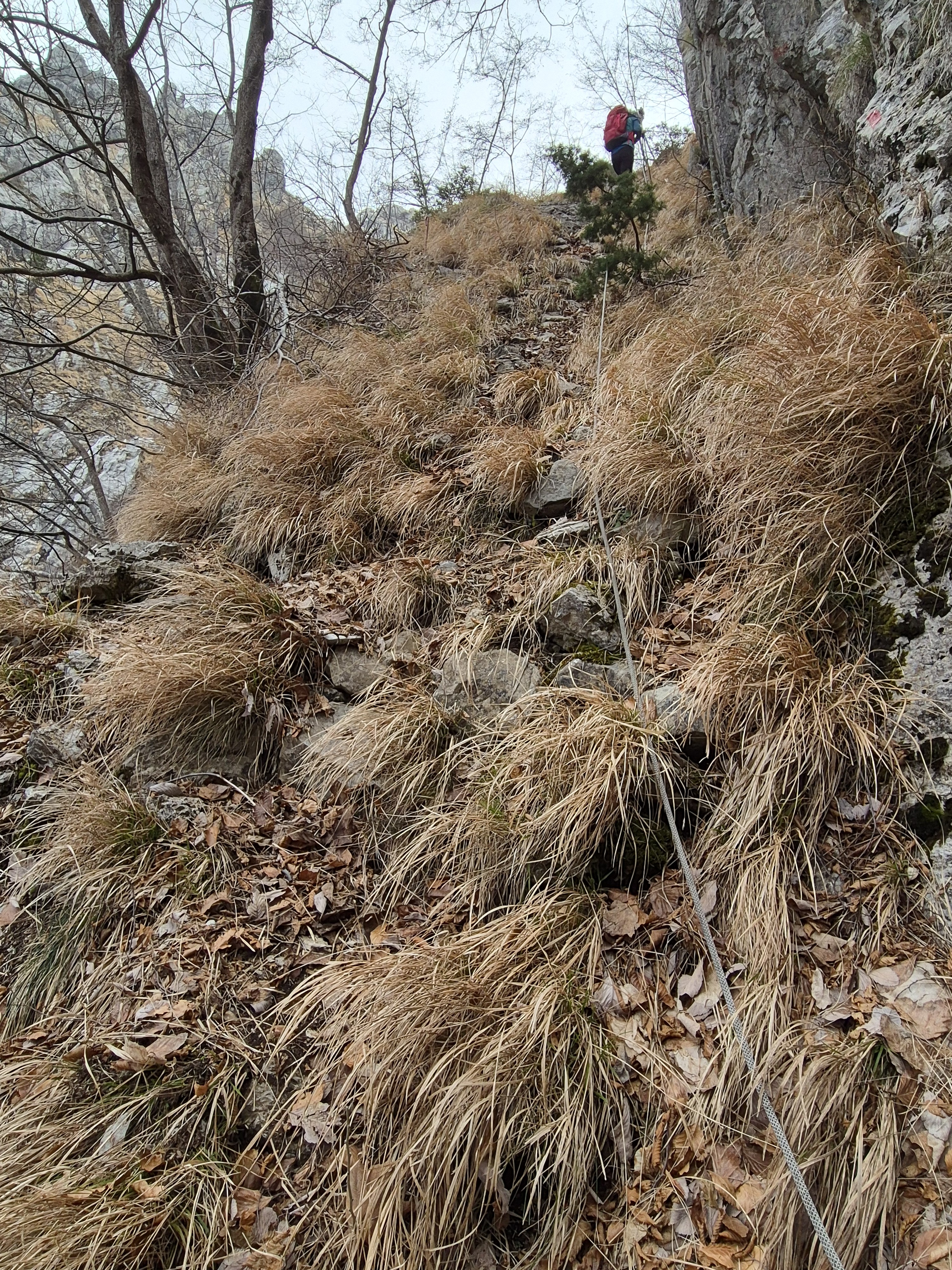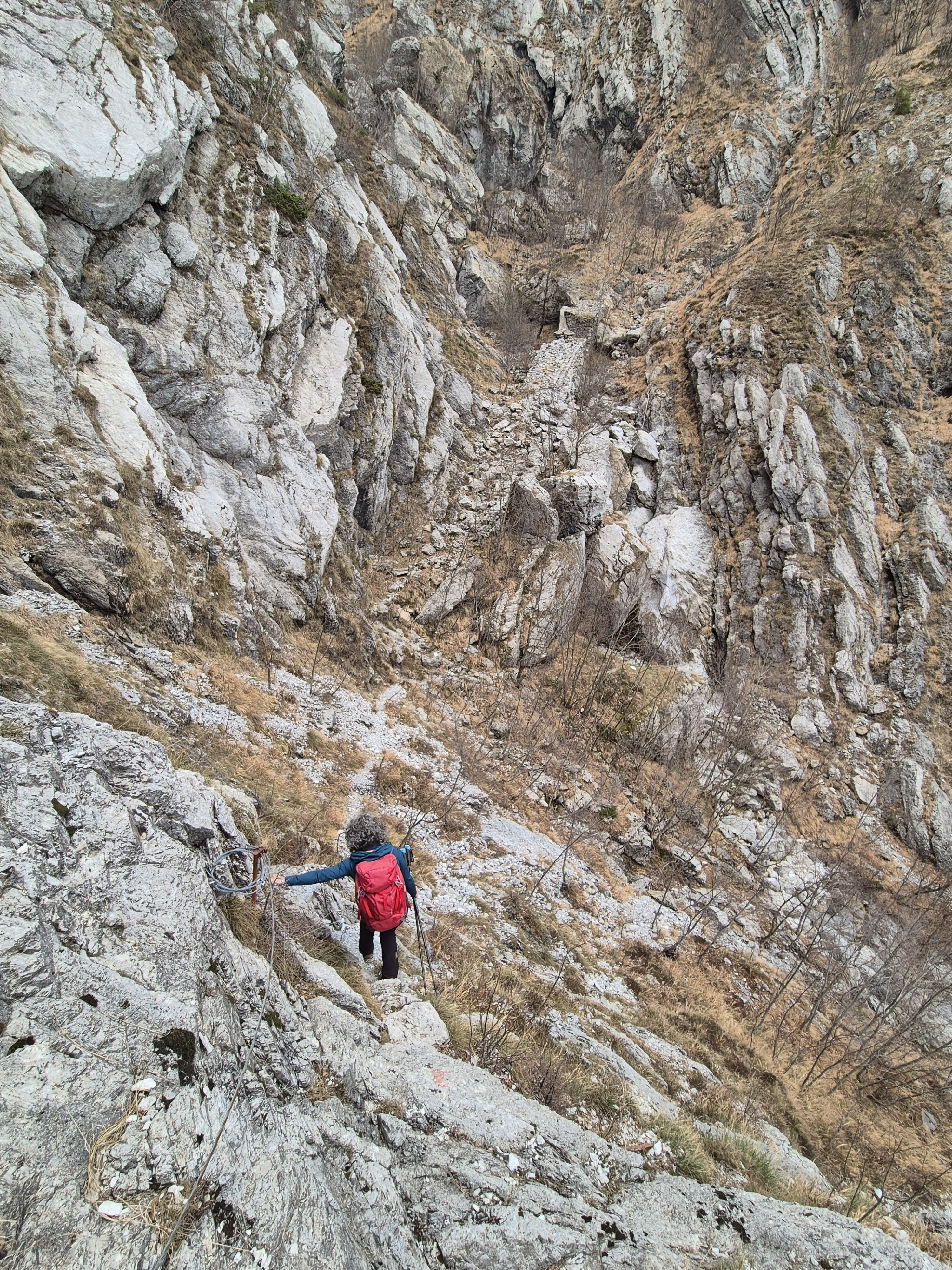 Lungo una cengia ripidissima ci aiuta un cavo fisso, poi seguono tratti un poco esposti, ma nettamente più semplici. Perdendo quota con rapidità arriviamo alla località All'Acqua dove si uniscono due dirupati canaloni: da quello a sinistra scende un'incredibile via di lizza, ma sospetto che in parte lo fosse anche l'ostica via appena percorsa da noi.