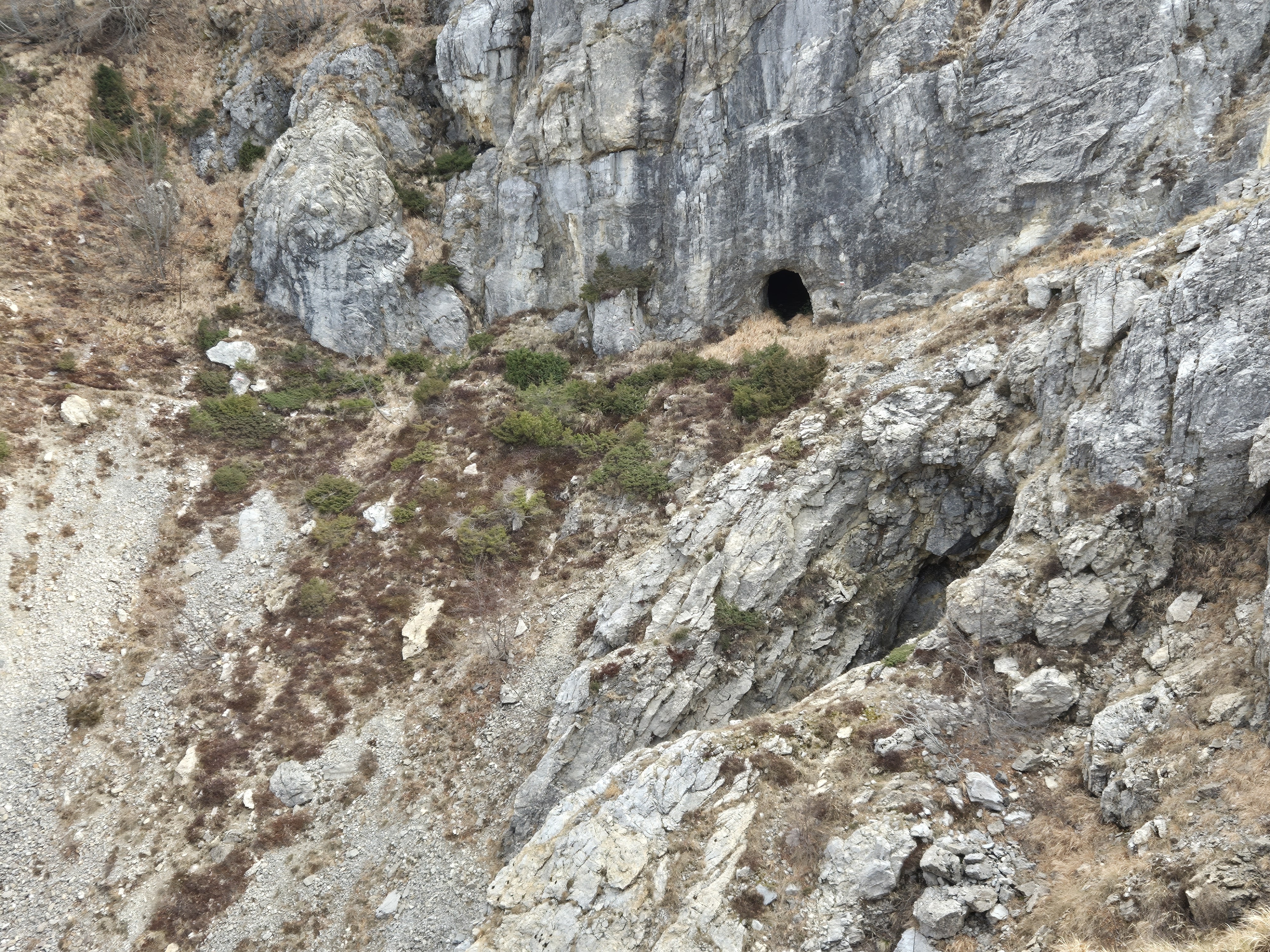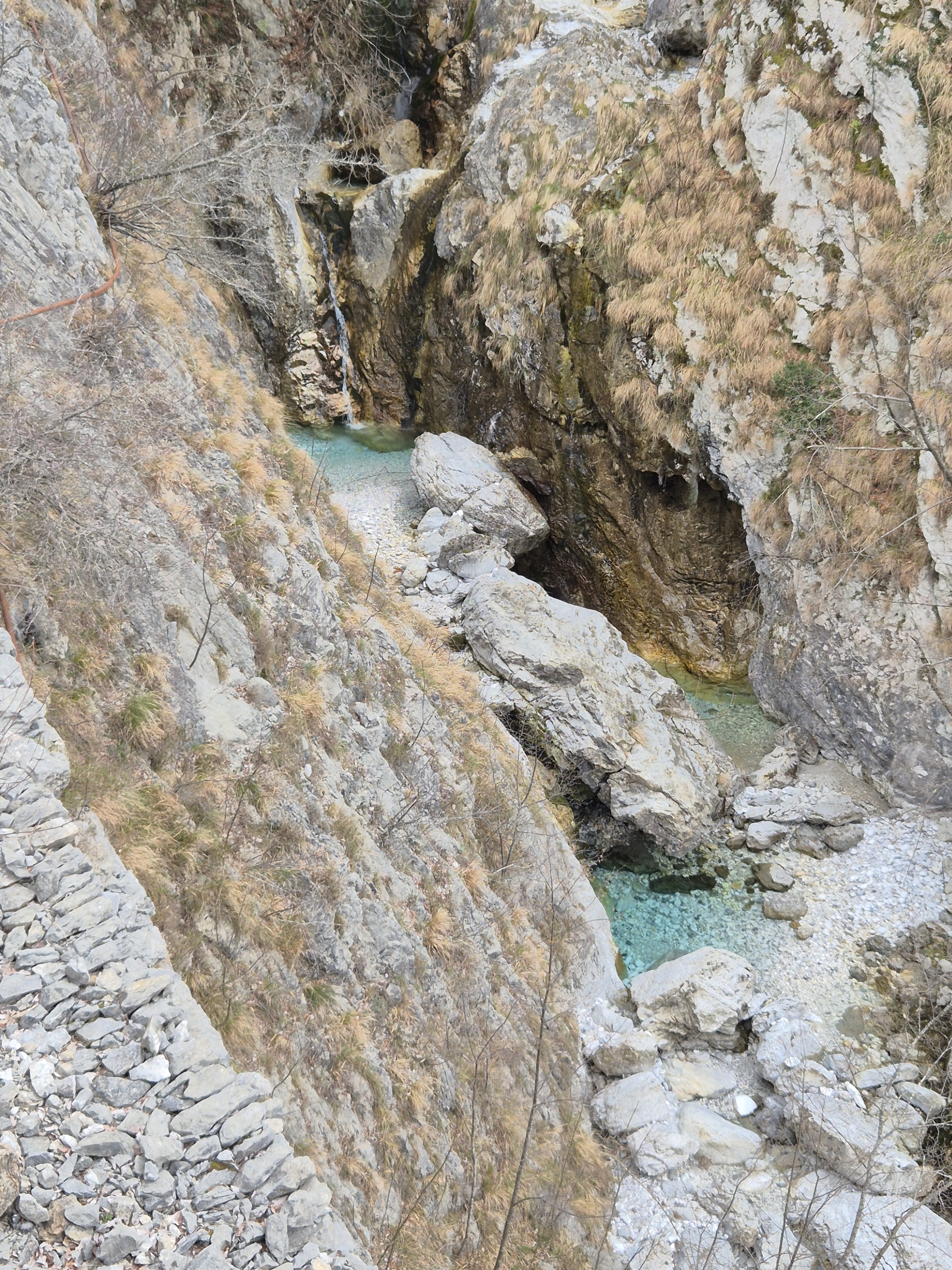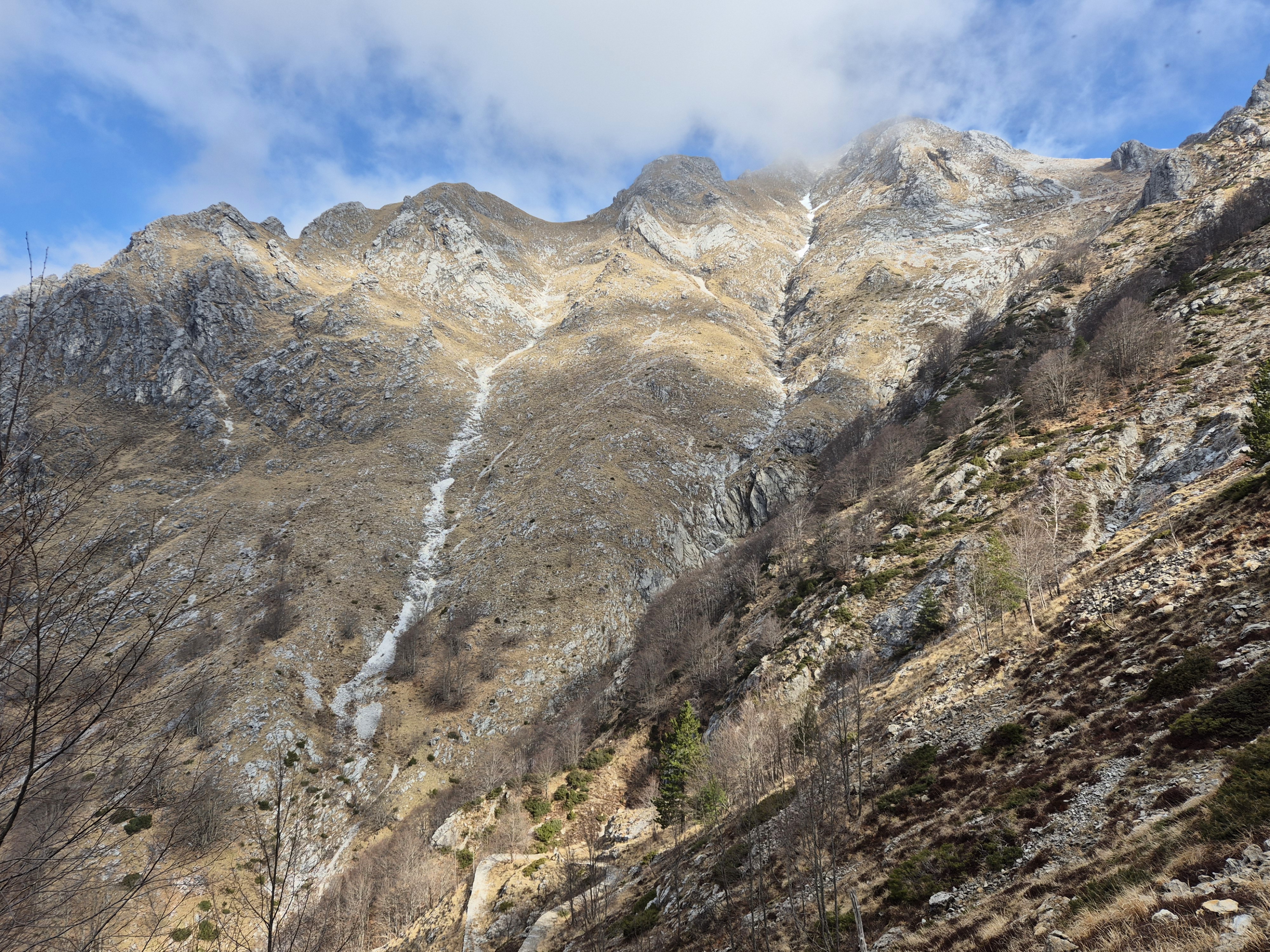 Lungo una cengia ripidissima ci aiuta un cavo fisso, poi seguono tratti un poco esposti, ma nettamente più semplici. Perdendo quota con rapidità arriviamo alla località All'Acqua dove si uniscono due dirupati canaloni: da quello a sinistra scende un'incredibile via di lizza, ma sospetto che in parte lo fosse anche l'ostica via appena percorsa da noi.
