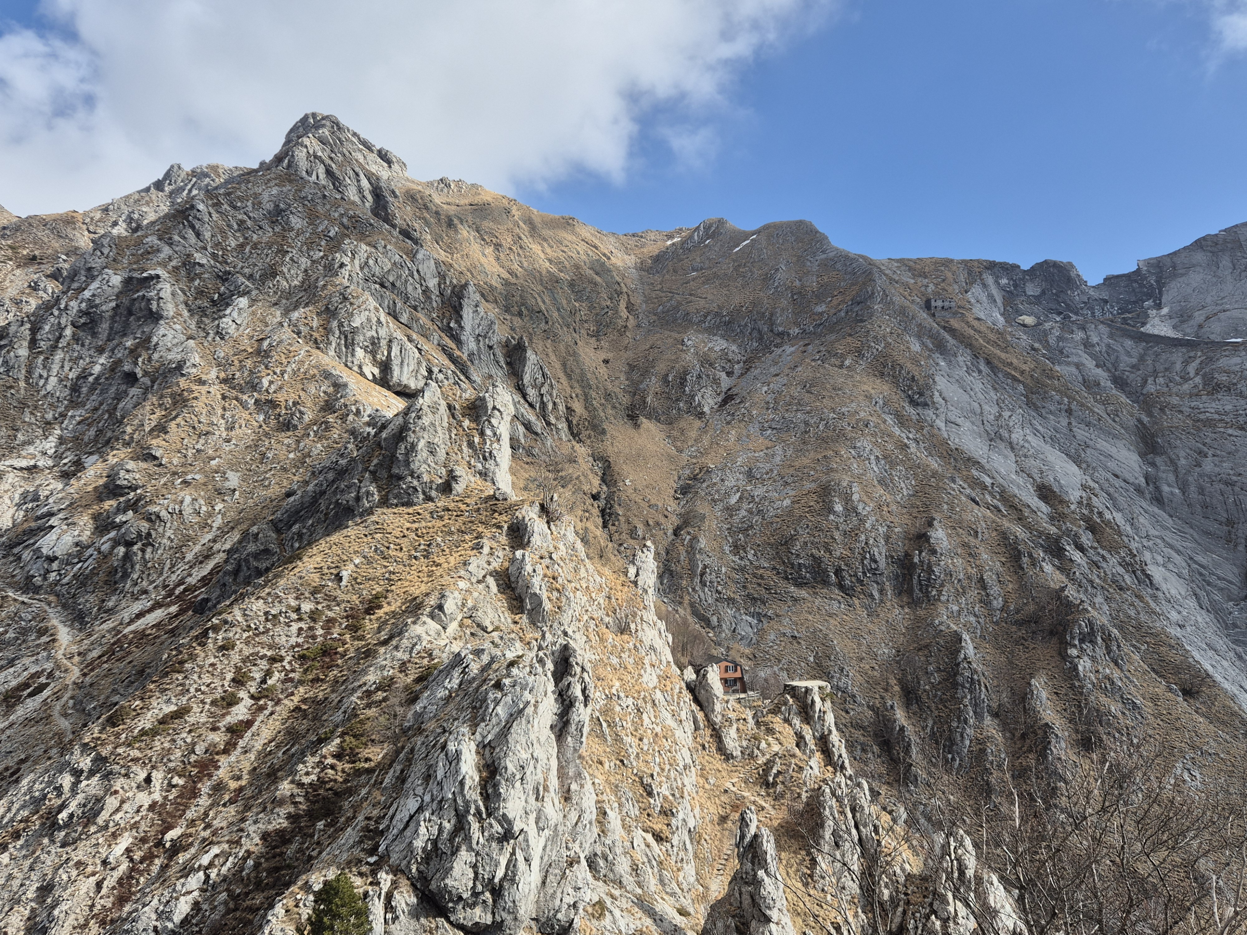 Il monte Focoletta, i Campaniletti e, a dx della cresta, il rifugio Nello Conti, dalla cima del picco dei Campaniletti