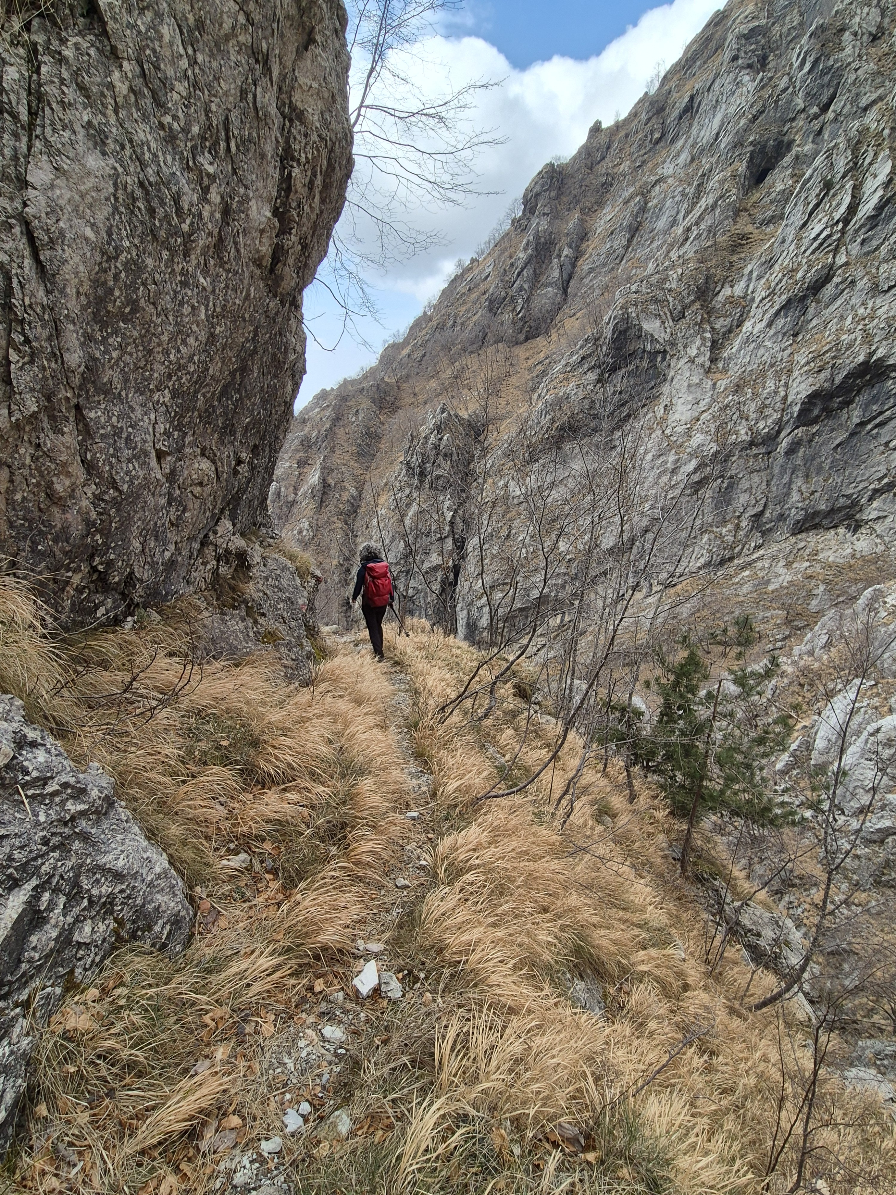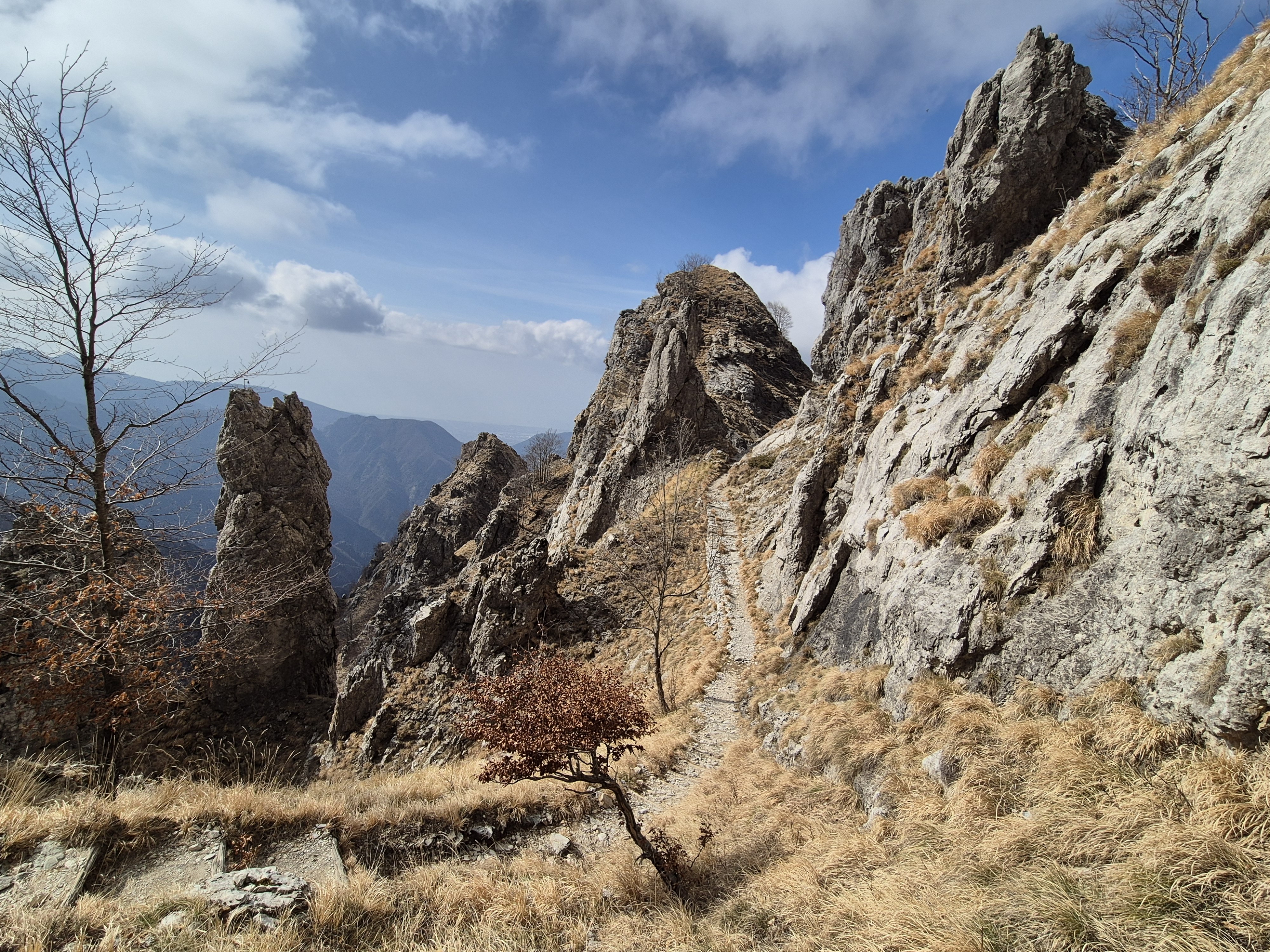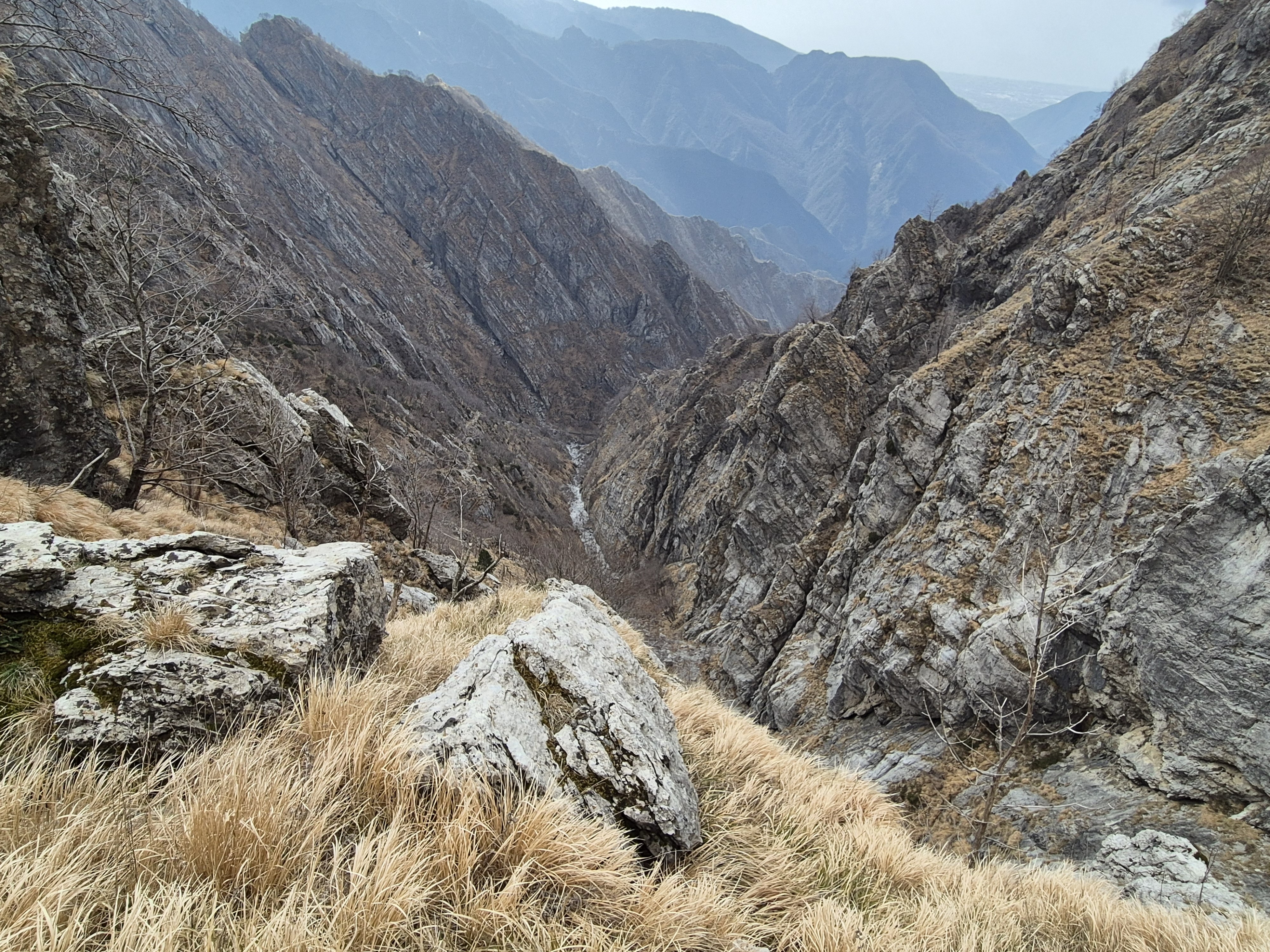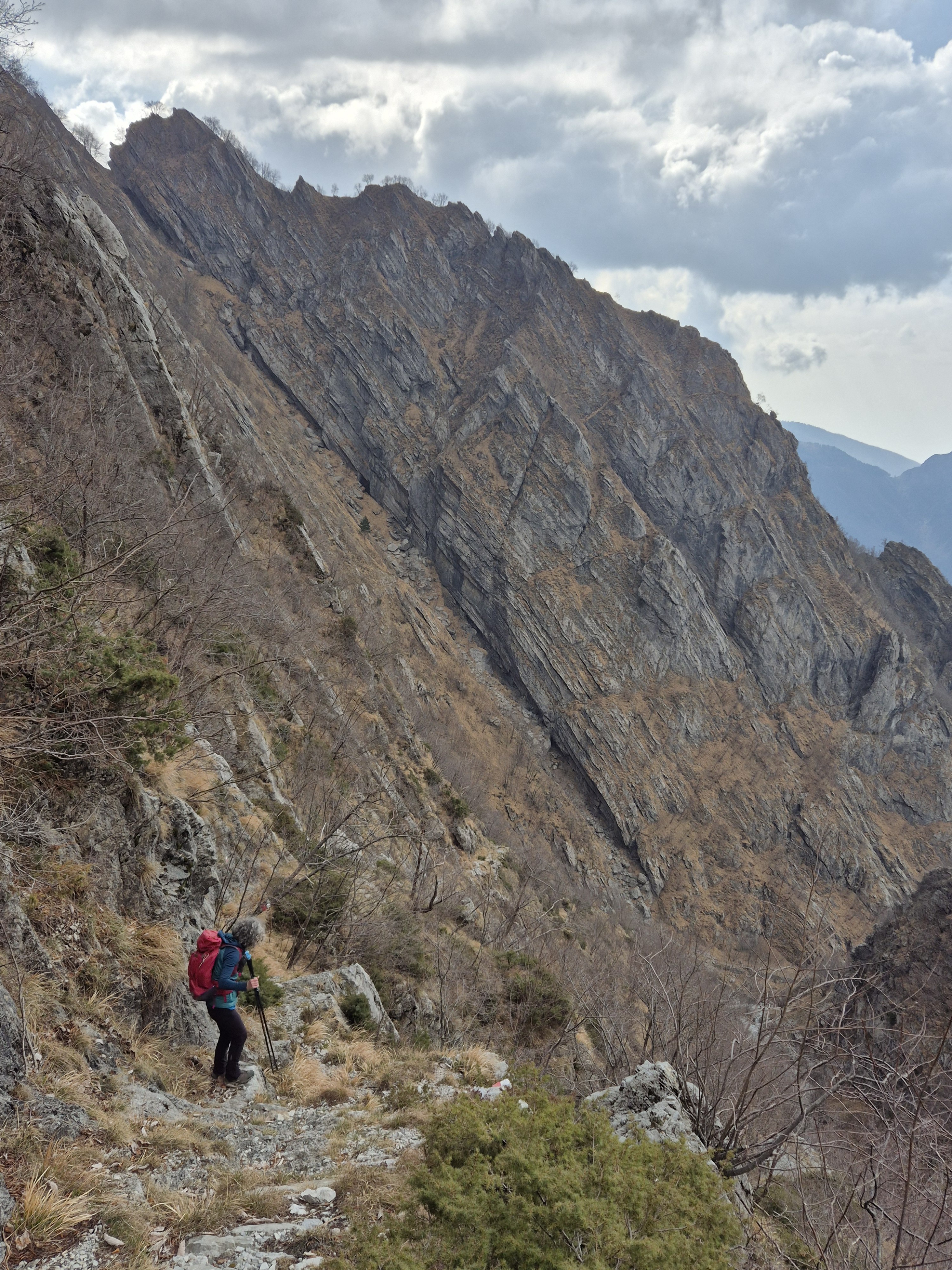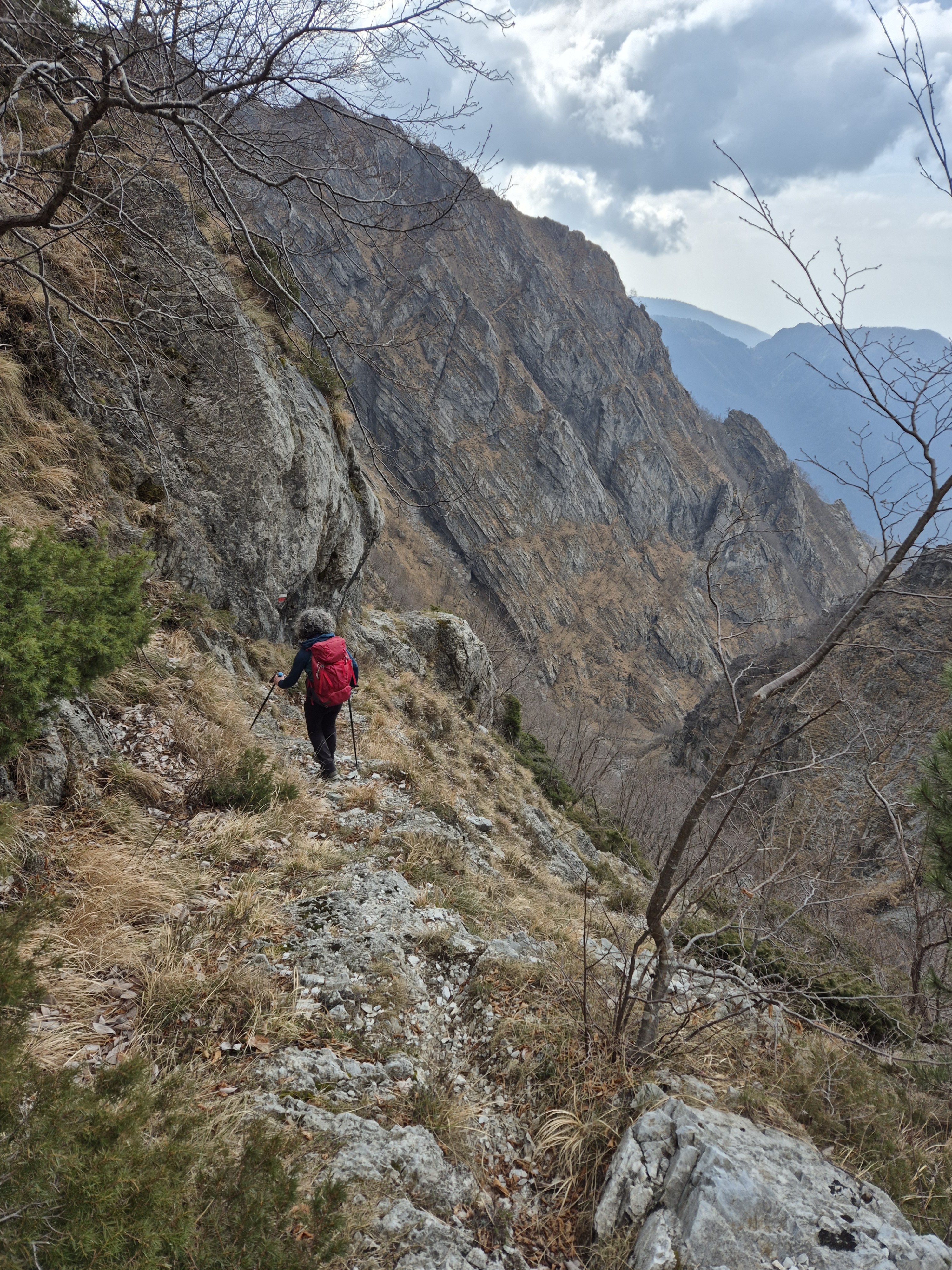 La cengia che scende verso la località All'Acqua e il canale dei Vernacchi (anche le immagini seguenti)
