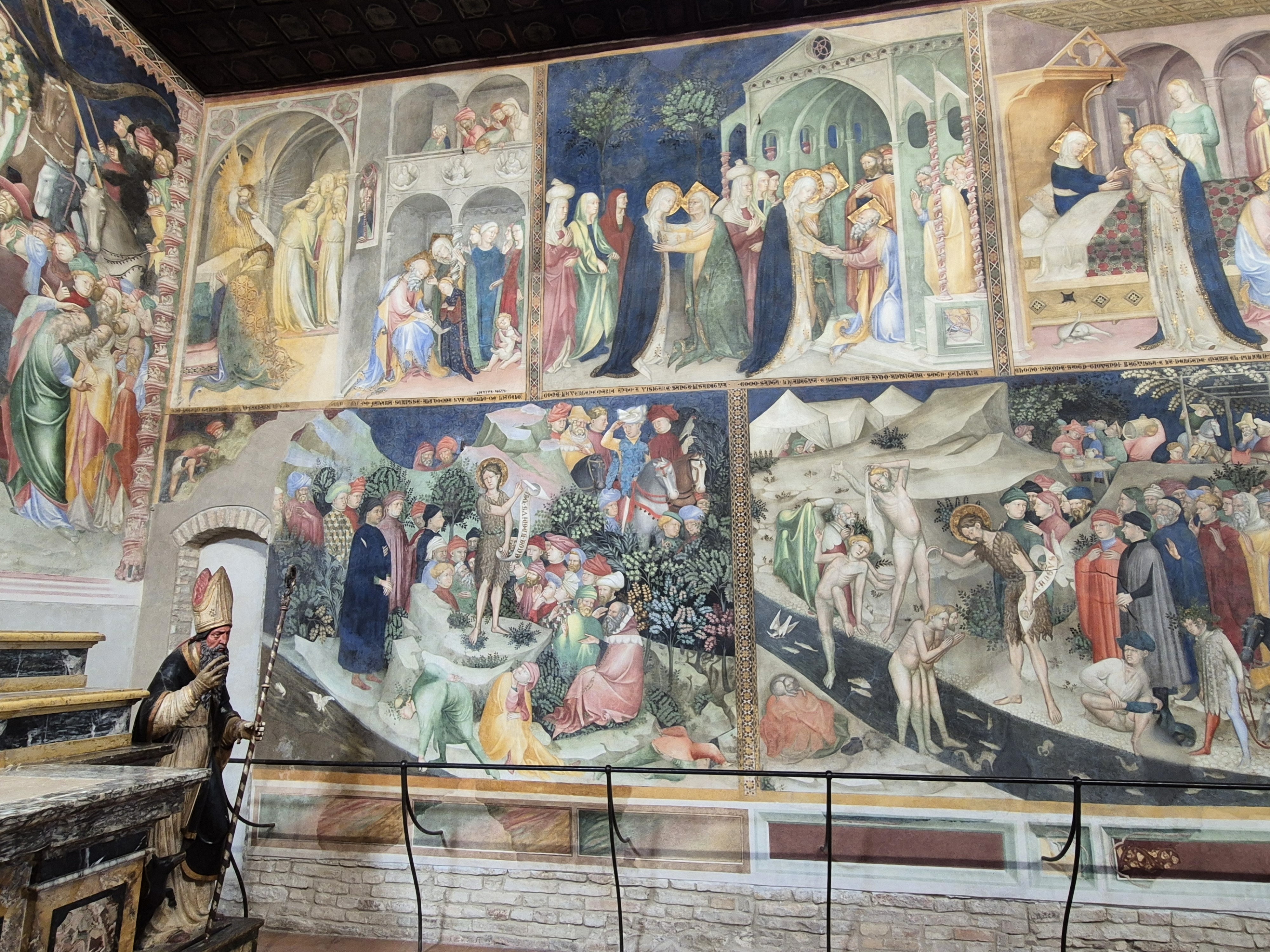 Questi affreschi, realizzati attorno al 1416 da Lorenzo e Jacopo Salimbeni, artisti marchigiani che lavorarono anche in Umbria pur non spostandosi mai troppo dalla terra natale, rappresentano uno dei vertici del gotico internazionale in Italia, e in particolare un momento di passaggio fra l'epoca artistica medievale, della quale mantengono la raffinatezza decorativa, e quella rinascimentale, evidente nell'uso razionale dello spazio, nella luce, nell'armonia della composizione, nella ricerca di una rappresentazione fedele, realistica dei personaggi.