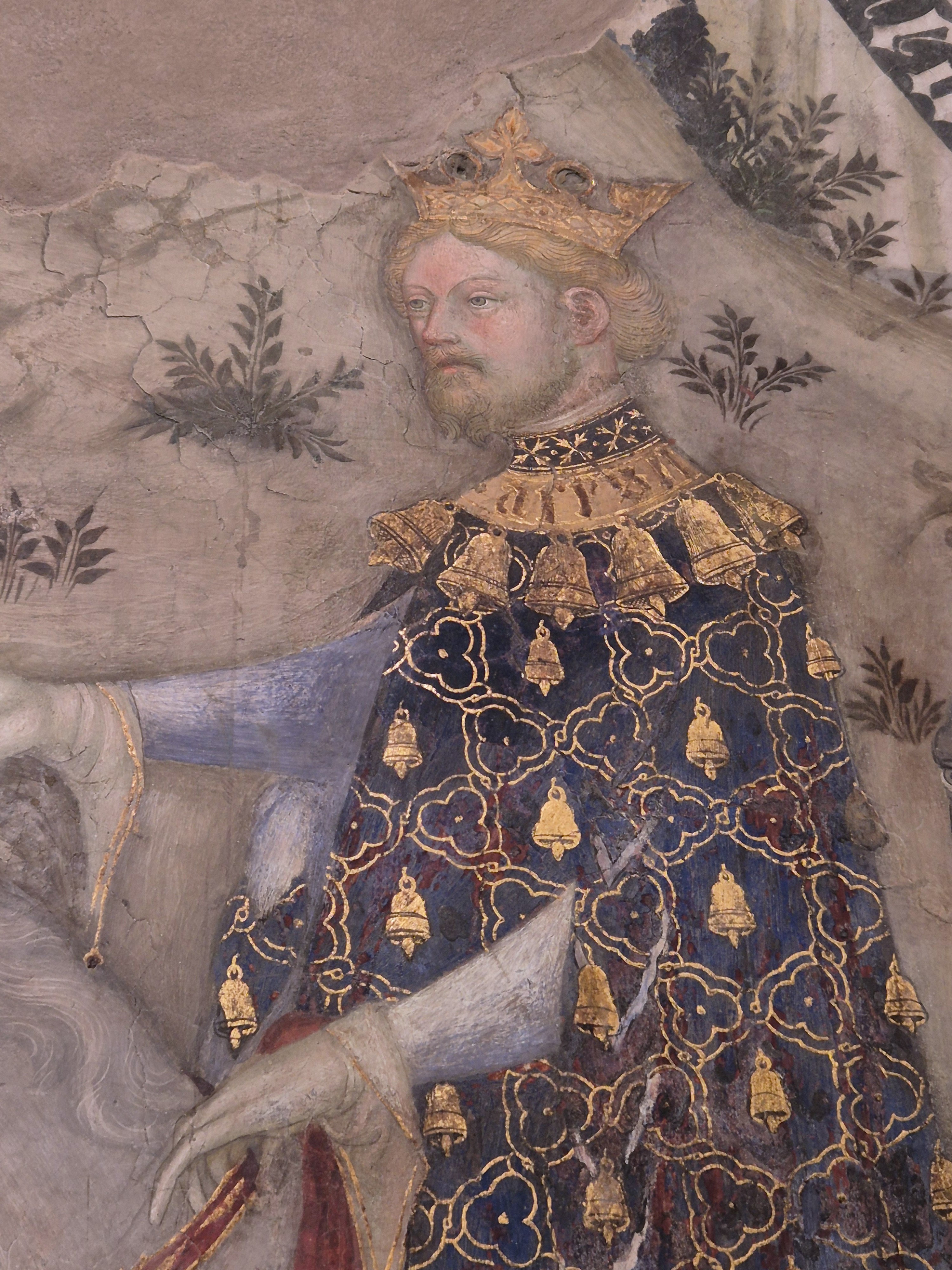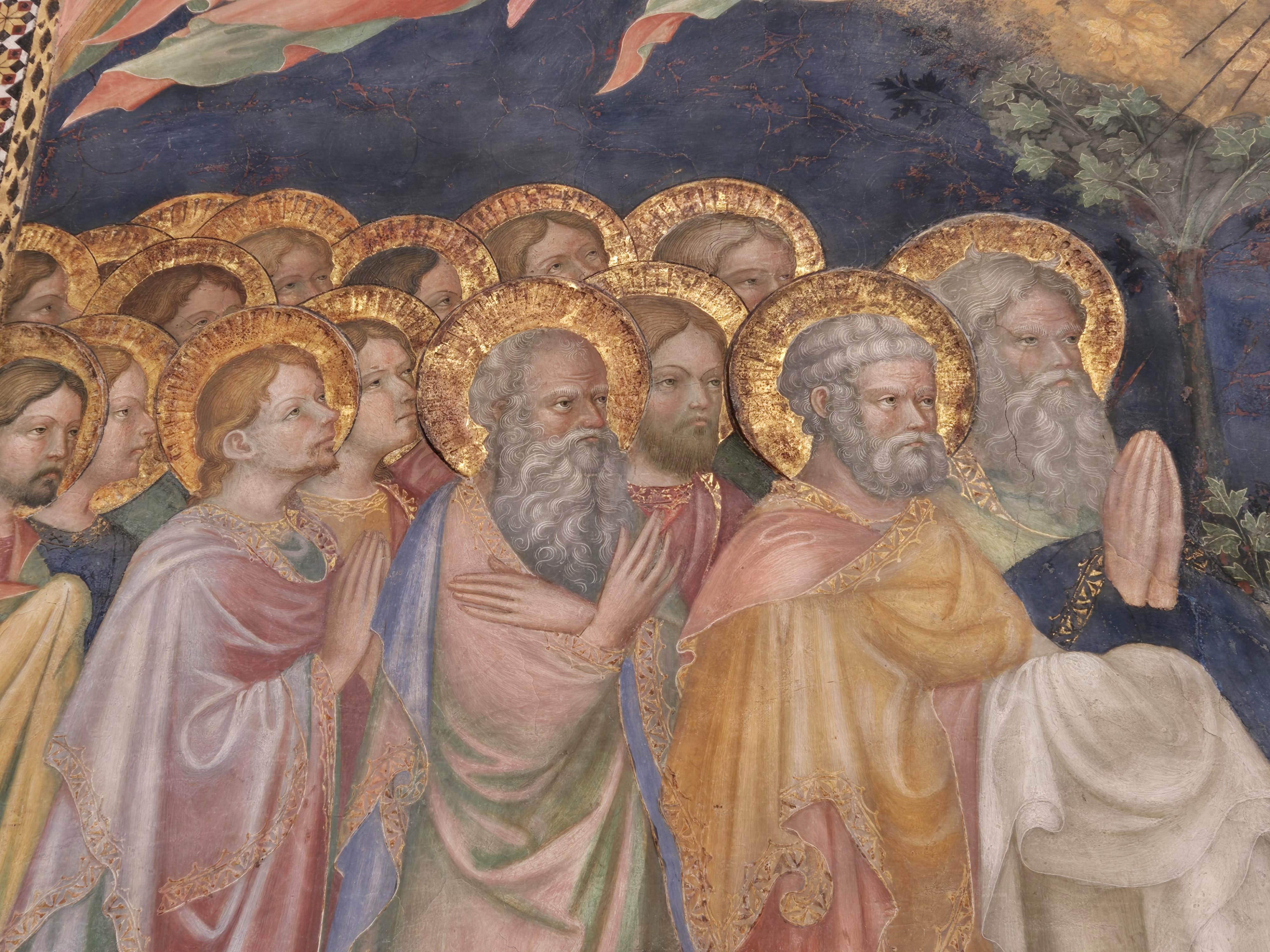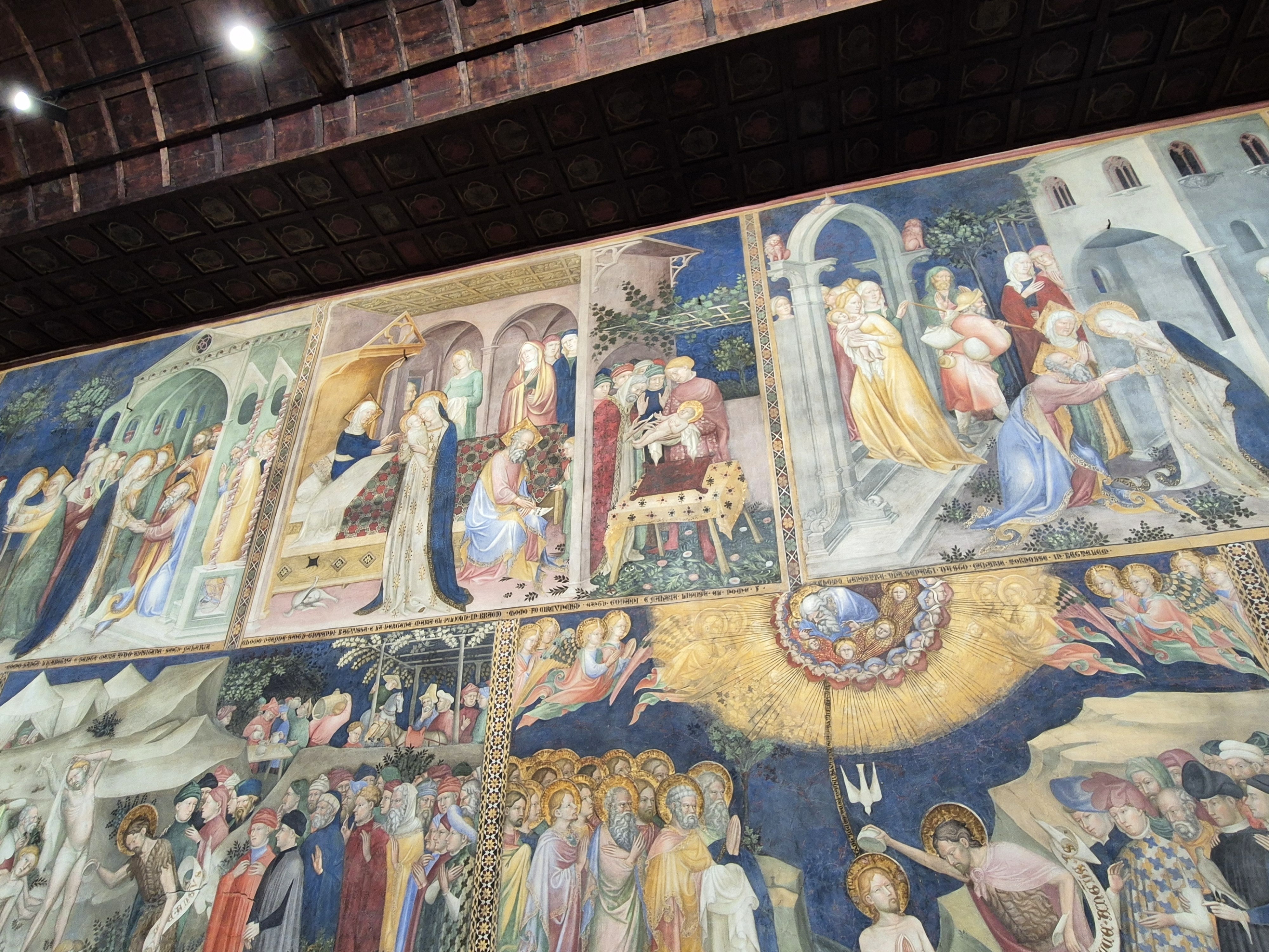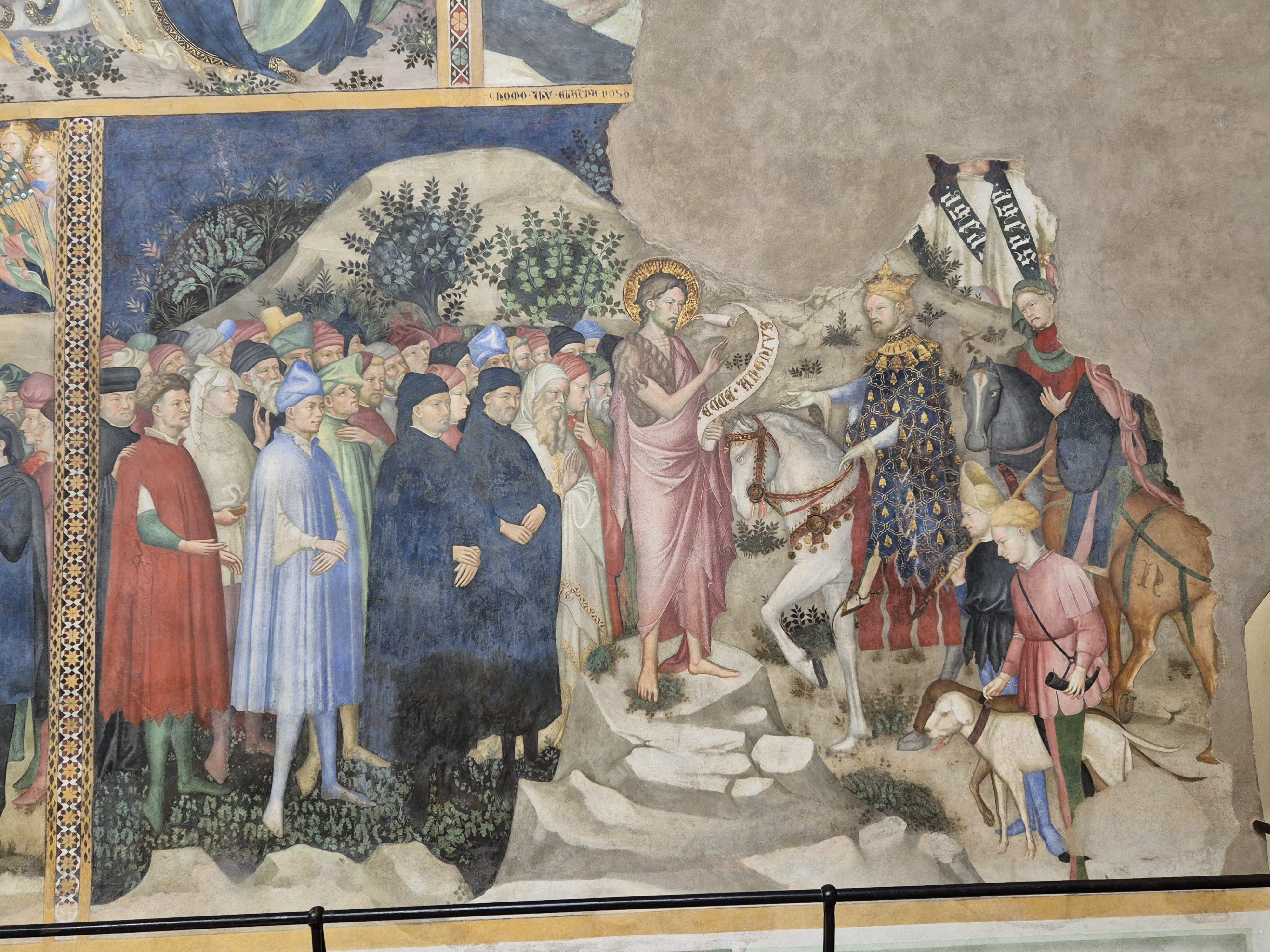La grandiosa "Crocifissione" nella parete di fondo è un potente, drammatico capolavoro e inevitabilmente attira l'attenzione con le sue mille figure in mille atteggiamenti e comportamenti differenti, dal cagnetto che si gratta in basso a sinistra al demone che si impossessa dell'anima appollaiato sulla croce in alto a destra.