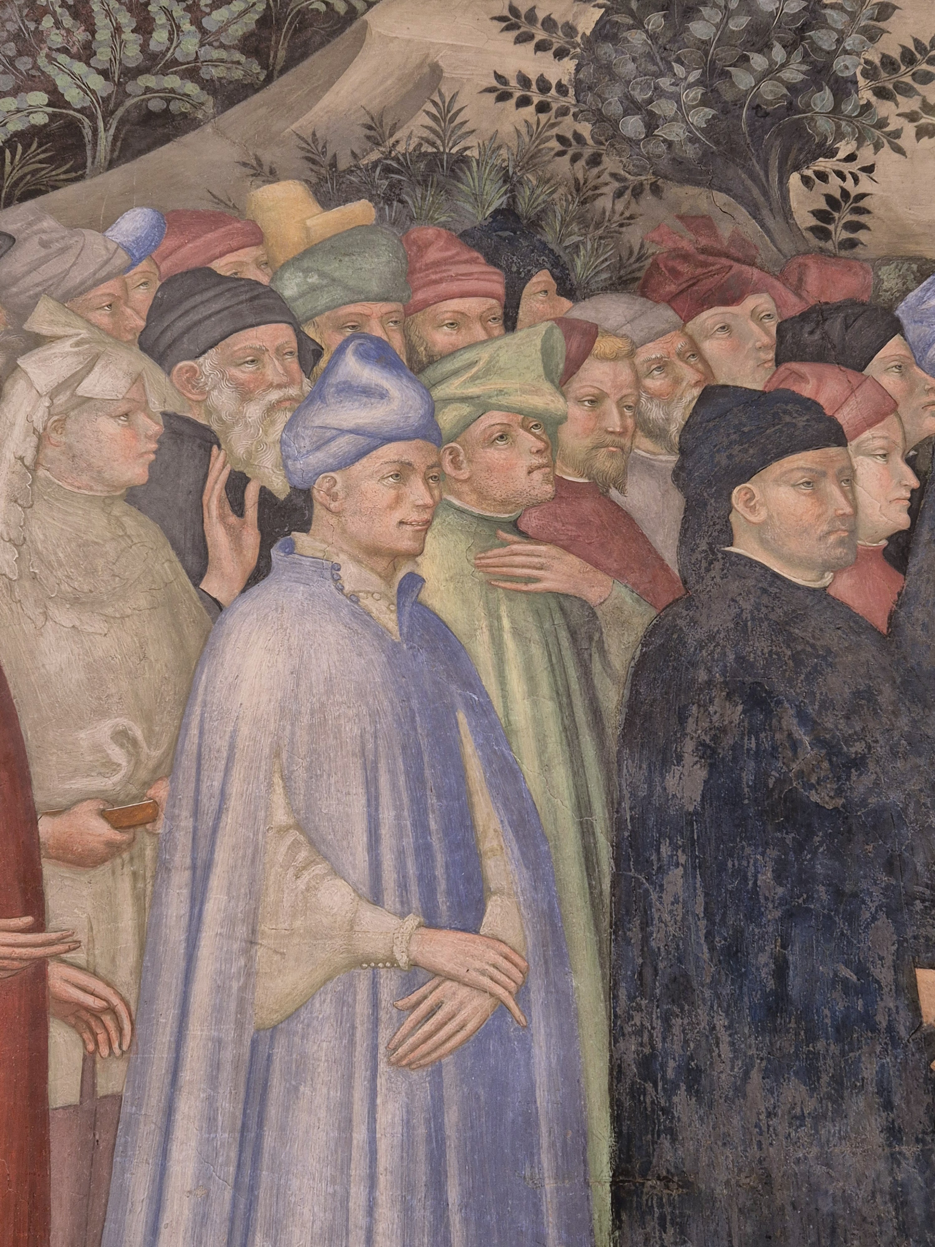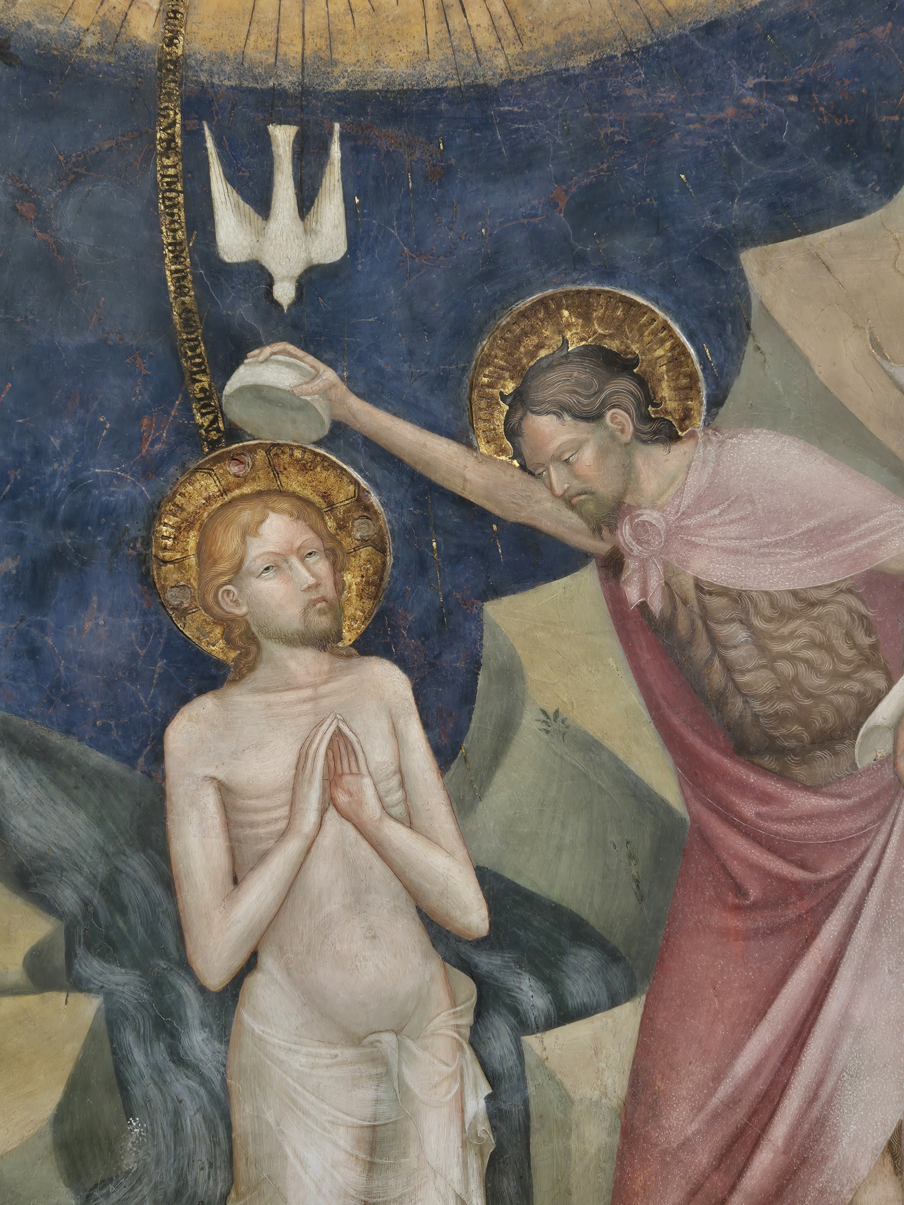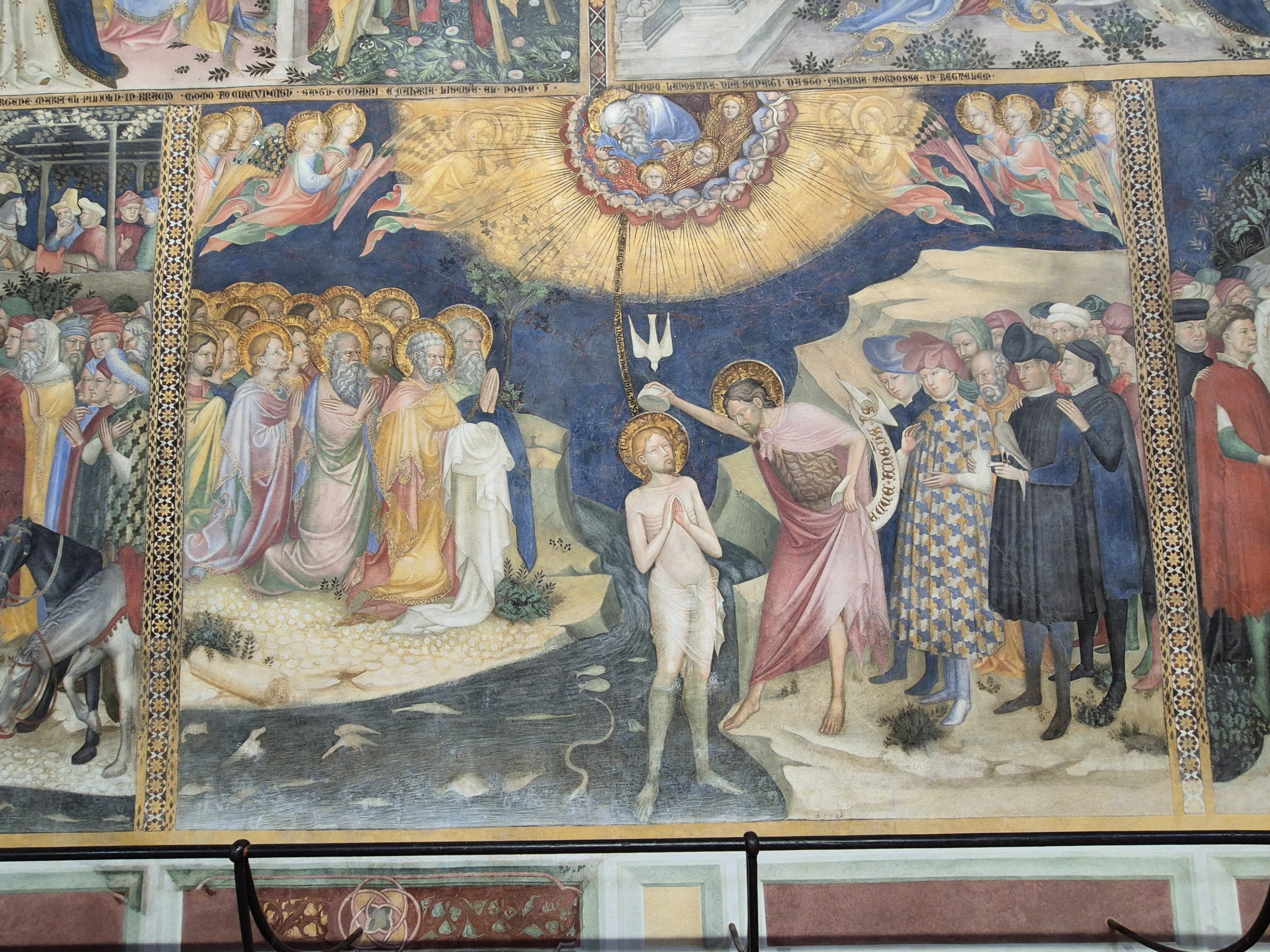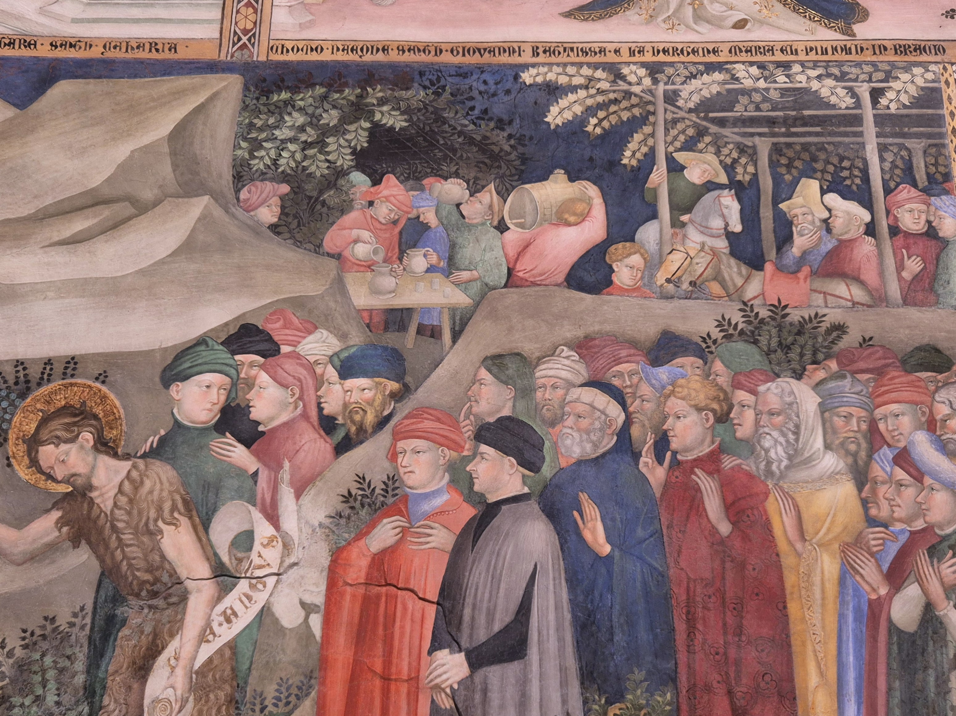 Ci si può poi concentrare sulle "Storie della vita di San Giovanni" che ricoprono interamente la parete destra, illustrate in grandi riquadri dove si mescolano scene sacre ad animati episodi di vita reale che rendono la narrazione vivace e coinvolgente: i personaggi hanno spesso espressioni e pose realistiche, dialogano fra loro, partecipano, hanno interessi, sono eleganti e alla moda, sono coinvolti, o curiosi, o indifferenti a ciò che succede: più si osserva, più si notano particolari che sorprendono per la naturalezza, come l'uomo che si sta spogliando in riva al fiume nella scena del Battesimo dei fedeli, o addirittura strappano un sorriso come nello stesso riquadro lo scorcio in alto dove fra alcuni avventori seduti a un tavolo un probabile ubriacone beve attaccandosi direttamente alla brocca.